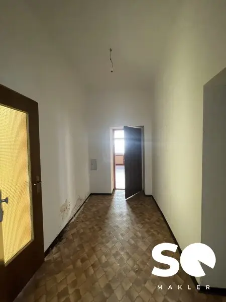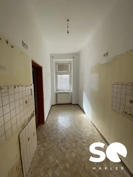 Ausgestattet ist das Objekt mit einem Holzparkettboden, Fliesen in den Nassräumen sowie einer Einbauküche. Die Beheizung und Warmwasserversorgung erfolgen über eine effiziente Gastherme. Die Wohnung befindet sich in einem sanierungsbedürftigen Zustand.