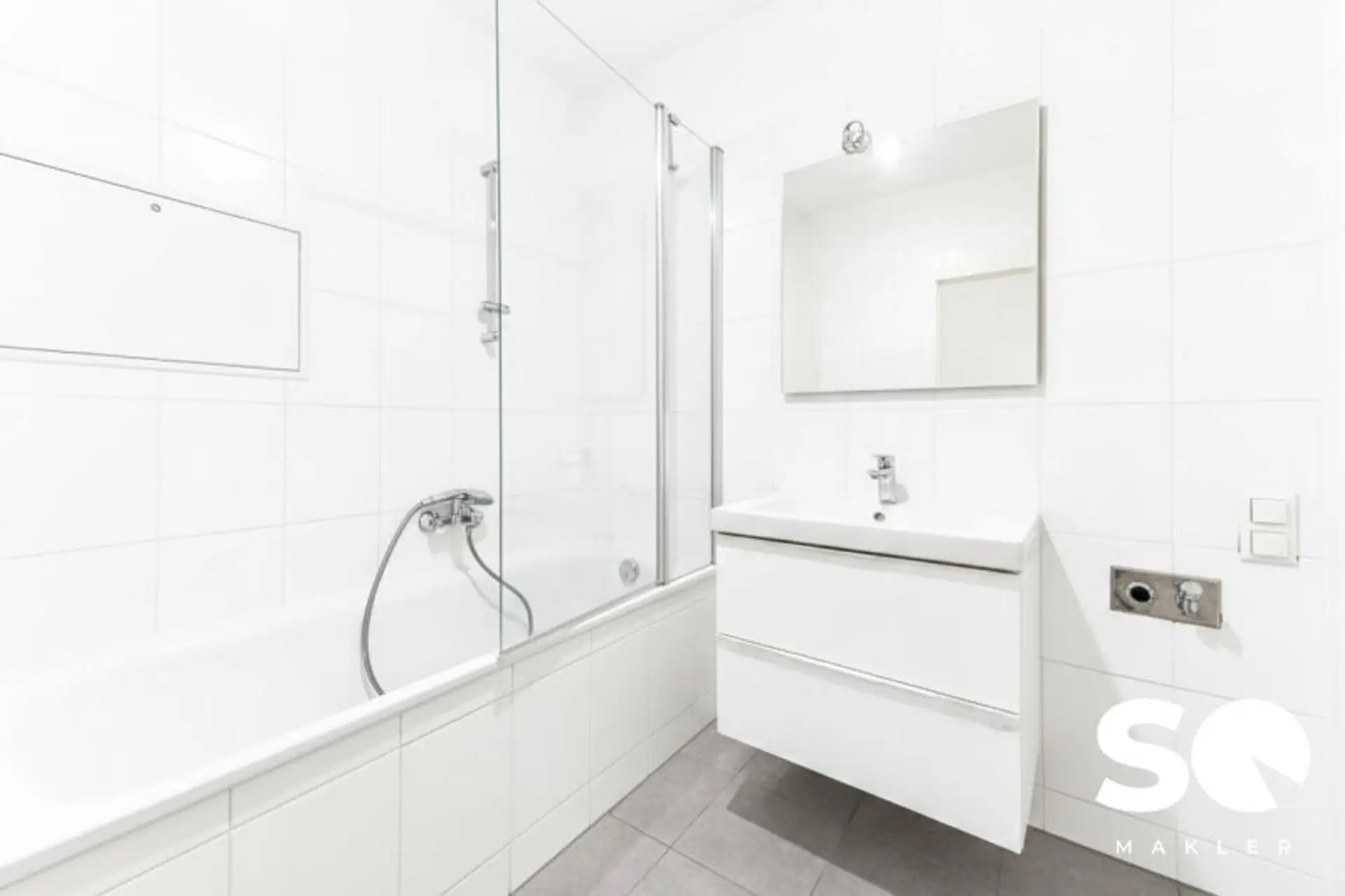 Mit Badewanne, Waschbecken und Waschmaschinenanschluss.