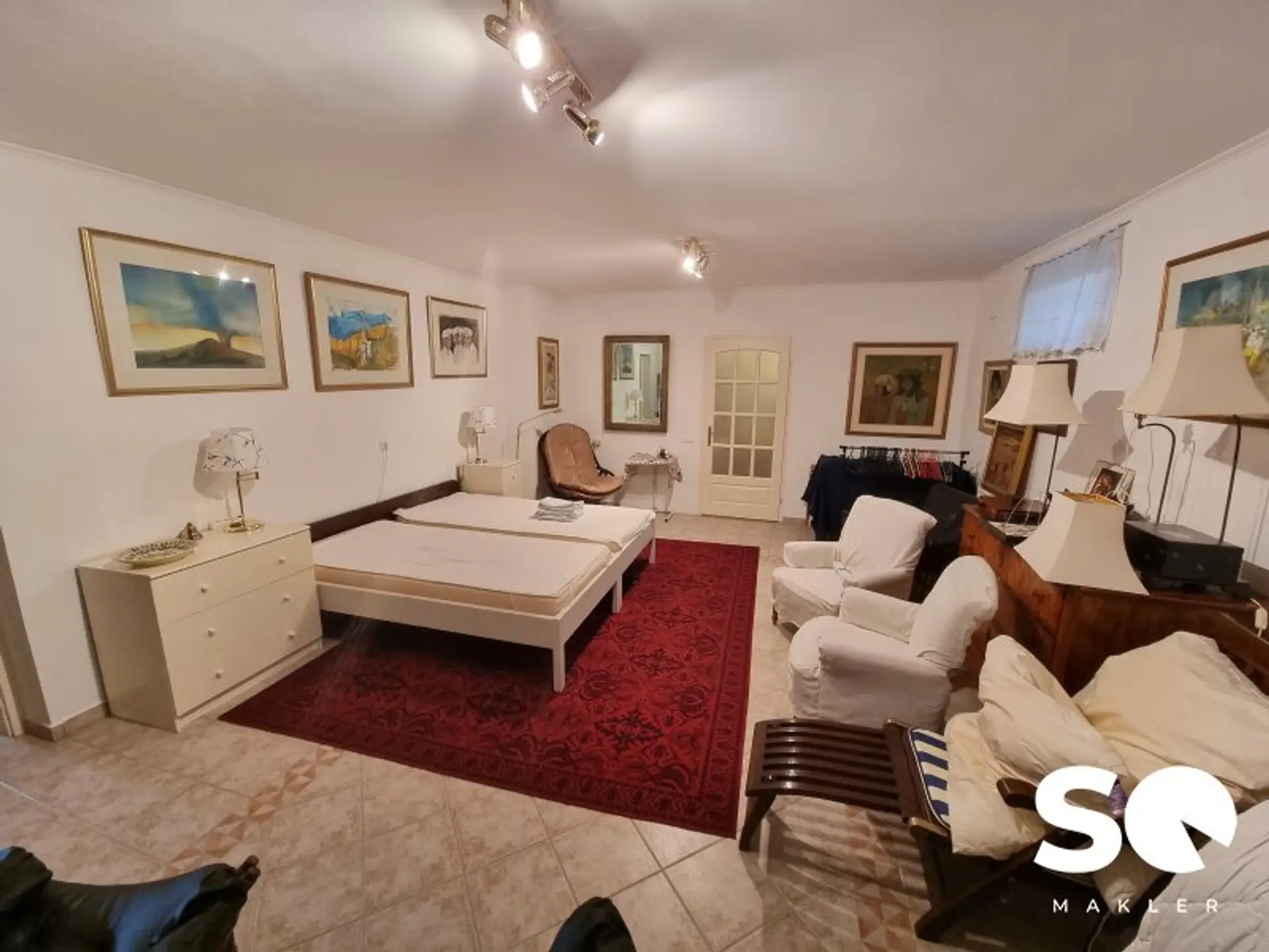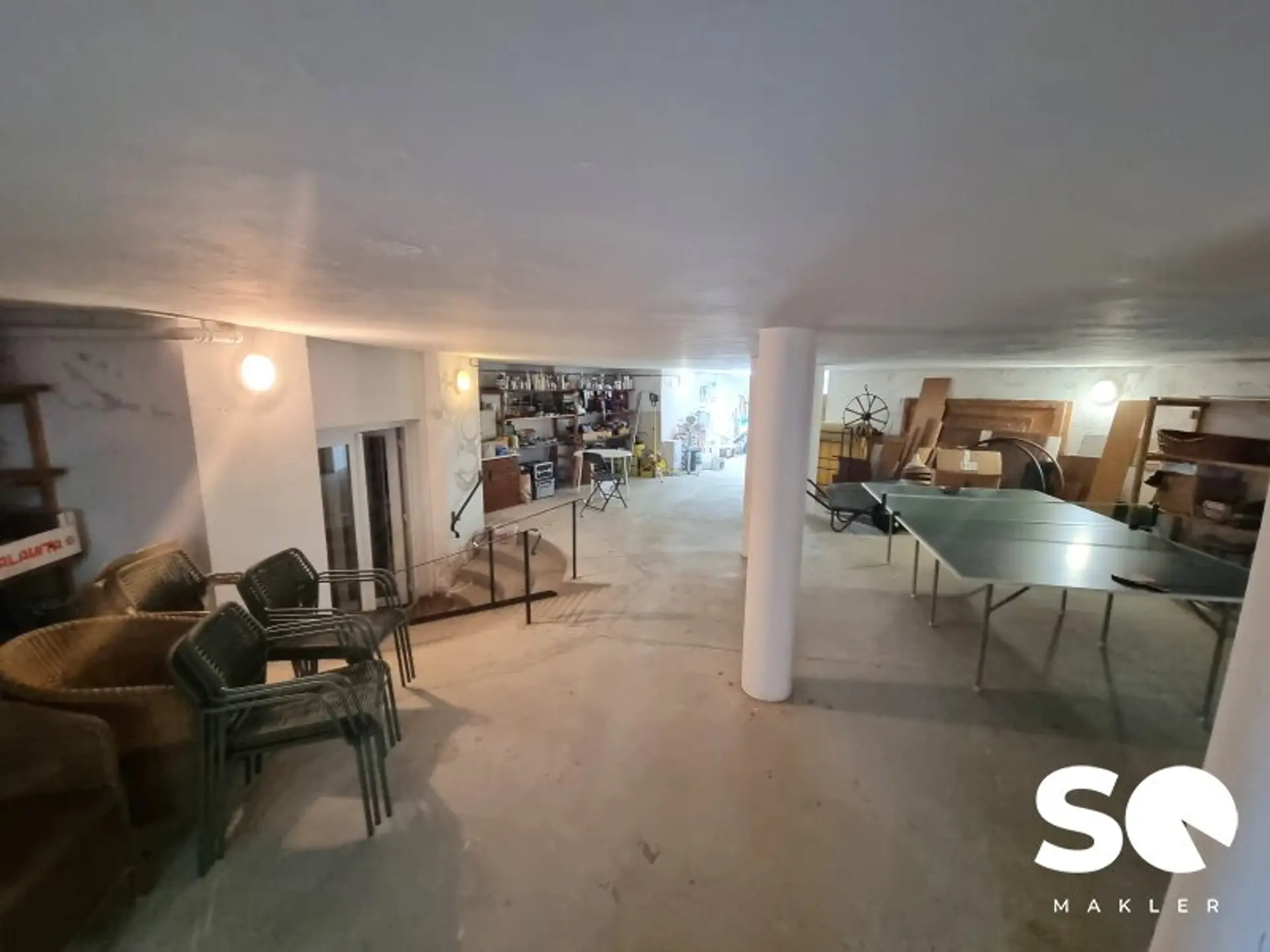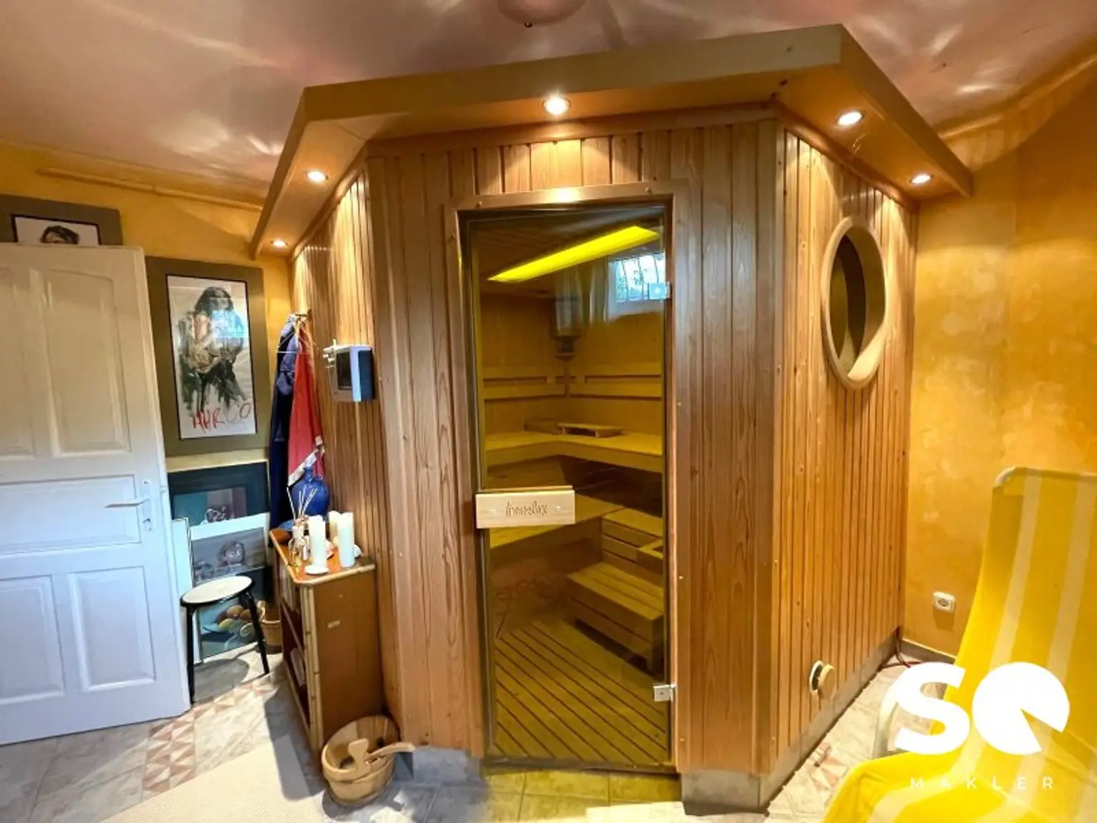Several rooms (currently partly used as bedrooms), bathrooms, a wellness area with bio sauna and infrared cabin, as well as spacious technical and storage rooms