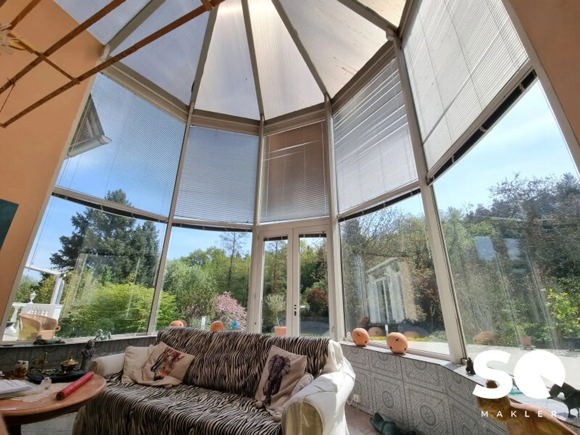Set on an expansive plot of approximately 6,000 m², idyllically situated at the edge of a forest, the prestigious residence offers around 700 m² of usable living space. A distinctive feature of the estate is that it comprises three consolidated parcels. Its unique architectural concept—two mirror-image residential units, each usable independently yet sharing a common entrance—opens up a wide range of premium usage possibilities. Generous ceiling heights, light-filled conservatories spanning two levels, and open, loft-style layouts create an inspiring environment for sophisticated living and creative work.