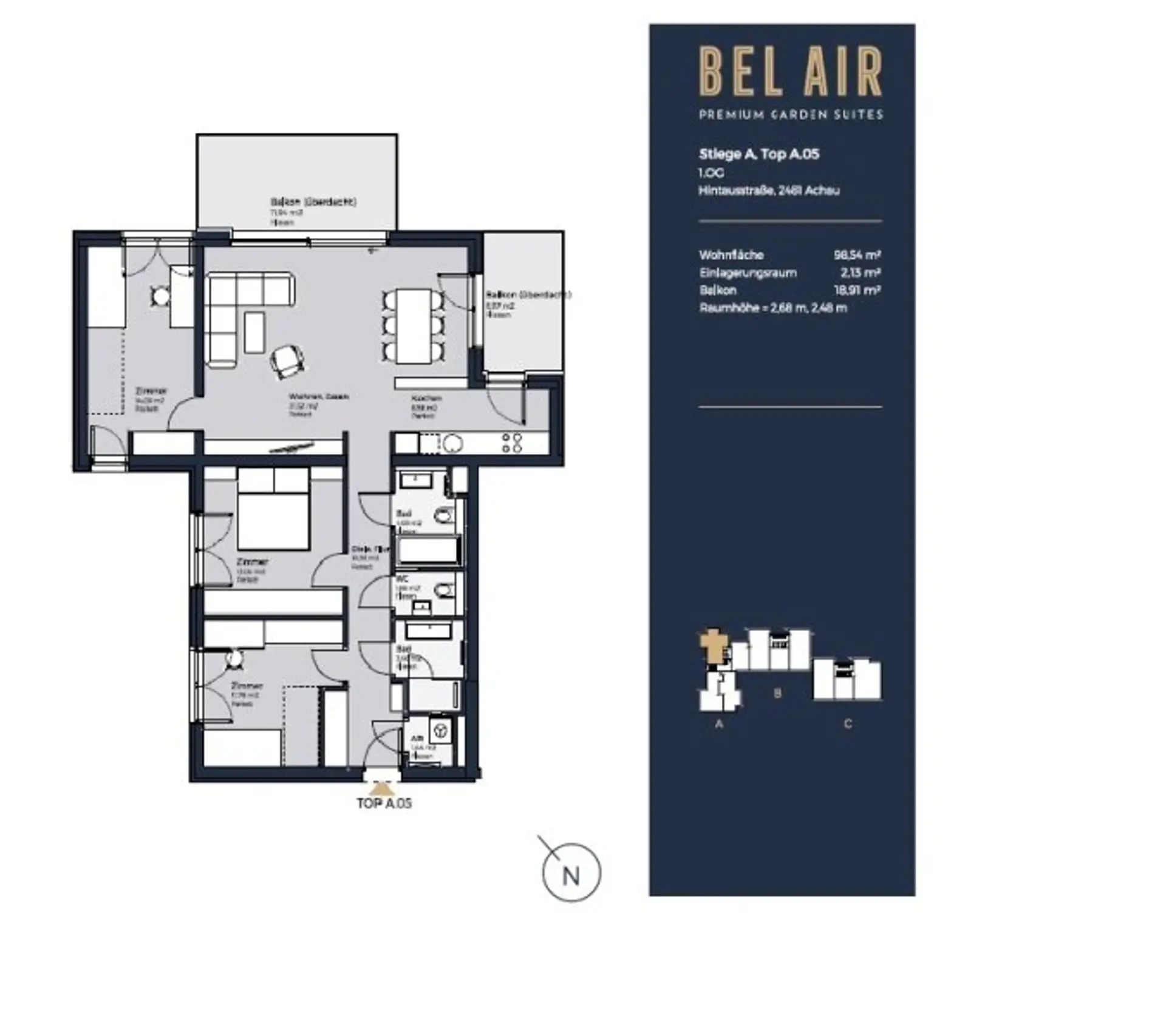 Bel Air bietet all DAS. In toller Umgebung werden in 3 Baukörpern traumhafte Eigentumswohnungen mit 56 m² bis 136 m² Wohnnutzfläche, zum Kauf angeboten. Der persönliche Freiraum in jeder Wohnung ist ein Muss. Sonne, Freiflächen. Aussicht.! Das durchdachte Raumkonzept mit idealer Aufteilung, ein großzügig angelegter Wohn-, Essbereich und großer Freifläche werden Sie begeistern. Egal ob Loggia, Balkon, Terrasse oder Dachterrasse. Die Ausrichtung ist fast immer nach Südwesten bzw. Süden. Bei der Grundrissplanung wurde auf absolute Privatsphäre und viel Sonne in jeder Wohneinheit geachtet. Eine Luft-, Wasserwärmepumpe mit Deckenheizung, und Deckenkühlung im Sommer, elektrischer Sonnenschutz bei allen Terrassentüren und Fenstern., Klimaanlage im DG vorbereitet, Holz-Alu Fenster von Katzbeck, SAT Anlage, etc. dies sind nur einige Vorzüge von diesem großartigen Wohnprojekt. Die Wohnungen bieten eine hochwertige Ausstattung mit Echtholzböden von Weitzer Parkett, 2,70 Meter Raumhöhe, edle großformatige Fliesen, wandbündige Innentüren, sowie natürlich modernste Sanitärkeramik. Im den DG Wohnungen ist ein offener Kamin sowie ein Grillplatz am Außenbalkon inkludiert.