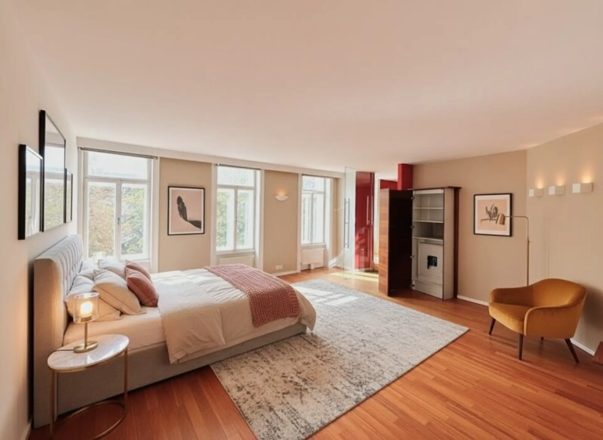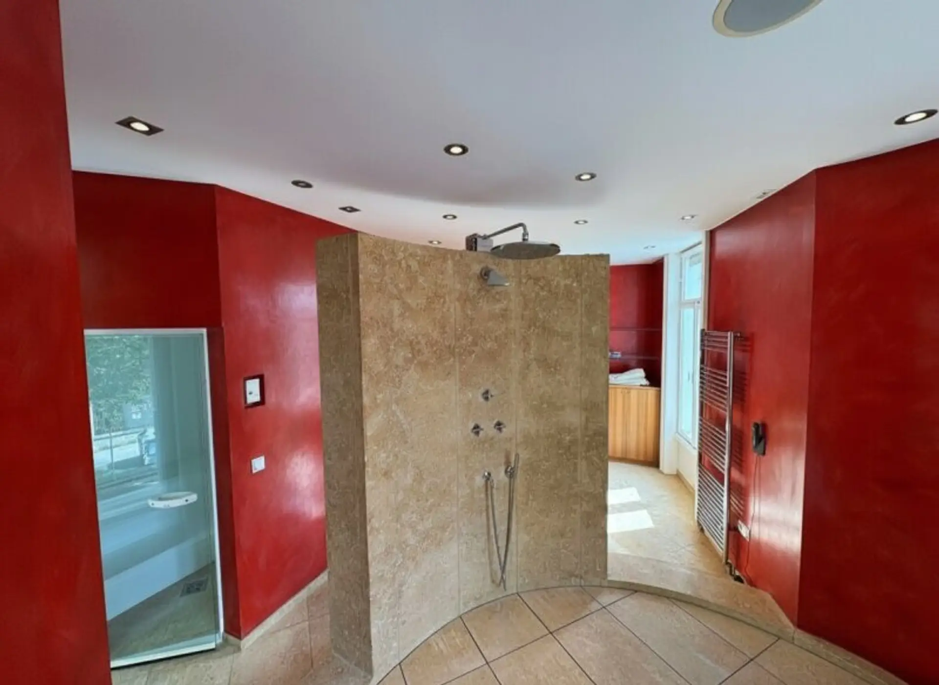 Das Masterbedroom besitzt eine Fläche von rund 34 m². Von hier aus hat man Zugang zum privaten Spabereich der Wohnung. Diese elegante Entspannungsoase bietet Ihnen eine Sauna, ein Dampfbad, eine Duschlandschaft mit Regenfalldusche die die runde Architektur des Eckturms aufgreift, eine eingelassene Badewanne sowie ein Designer-Doppelwaschbecken in Steinausführung.