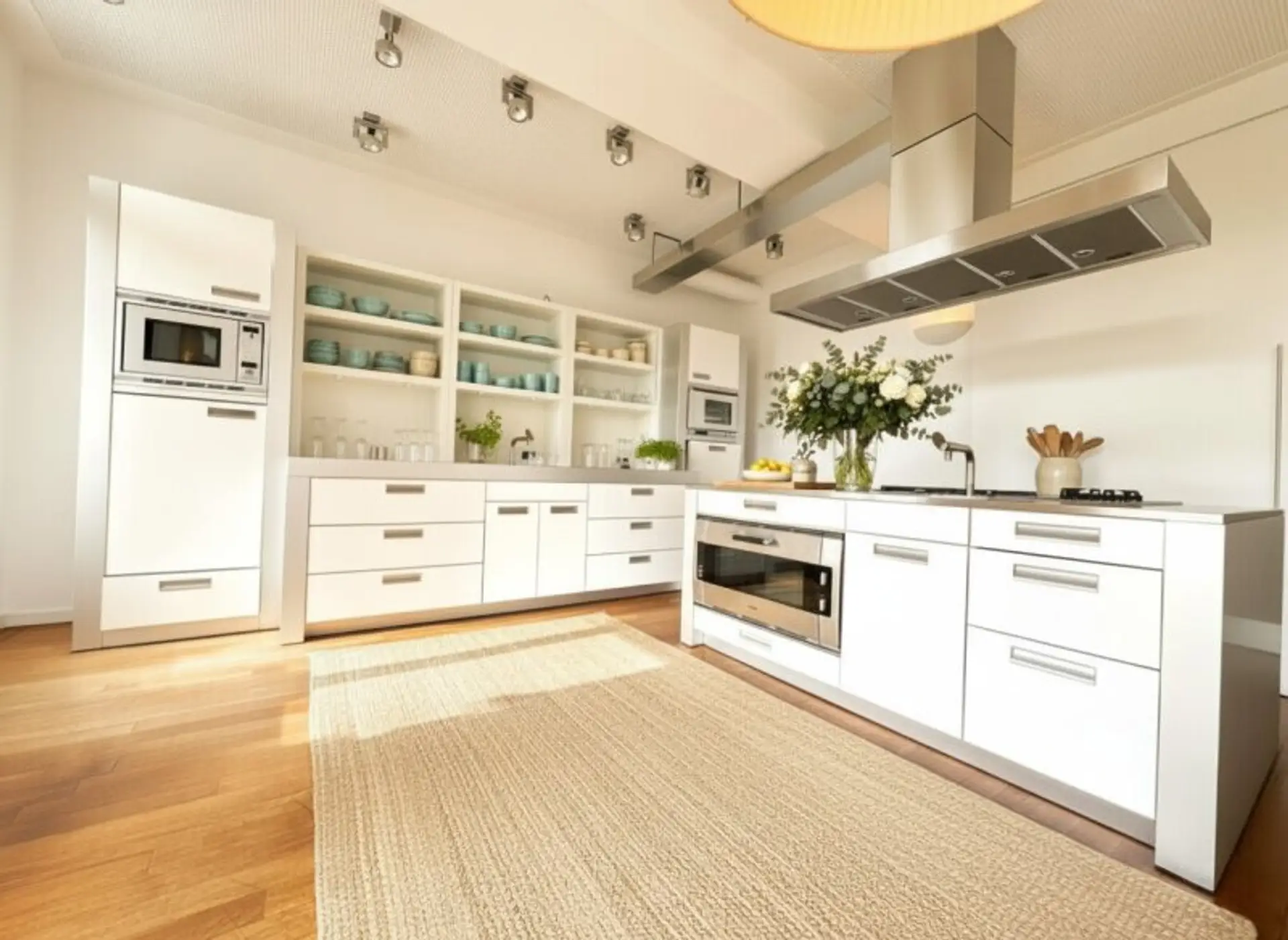 Geradeaus gelangt man in die rund 52 m² große Wohnküche. Von hier aus kann der charaktervolle Süd-Balkon mit Arkadengang betreten werden. Die moderne, helle Einbauküche vom exklusiven Küchenbauer "Gaggenau" verfügt über eine Kücheninsel mit Gasherd und funktionsstarkem Dunstabzug. Vier bodentiefe, südseitig ausgerichteten Flügelfenster bieten einen breiten Blick in die begrünte Umgebung des Hauses und lassen viel Sonnenlicht in dieses exklusive Wohnzimmer.