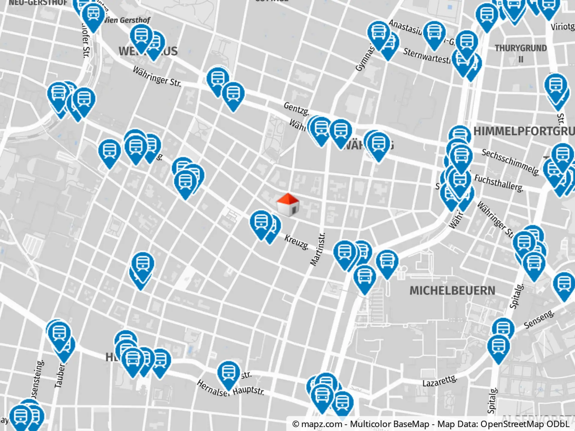 - Nachtbus: N8 Michelbeuern AKH (6 Gehminuten), N41 Martinstraße (7 Gehminuten), N43 Alser Straße (15 Gehminuten)