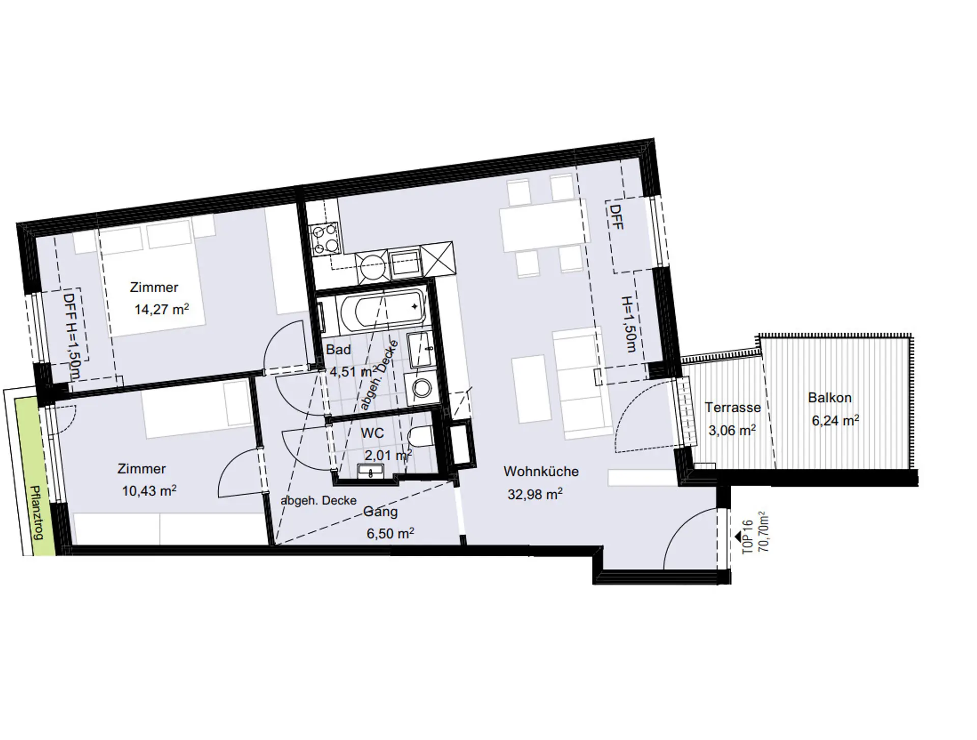 Diese Wohlfühlwohnung bietet Ihnen alles, was es für das harmonische Familienleben oder eine fröhliche WG braucht. Überzeugend ist voll allem die geschickte Raumaufteilung: Jedes der 2 (Schlaf-) Zimmer ist zentral begehbar. Beeindruckende "Über-Eck" ausgeführte Dachflächenfenster sorgen für einen ungetrübten Blick in den Himmel und bringen tagsüber die Zimmer zum Strahlen. Vom Wohlfühl-Wohnzimmer haben Sie Zugang zum innenhofseitigen Balkon. Tagsüber begeistert die Wohnung mit lichtdurchfluteten Räumen durch bodentiefe Fenster. Das Badezimmer punktet mit Fliesen aus elegantem Feinsteinzeug und ist mit Badewanne und WM-Anschluss top ausgestattet. DieToilette samt Handwaschbecken ist separat gelegen.