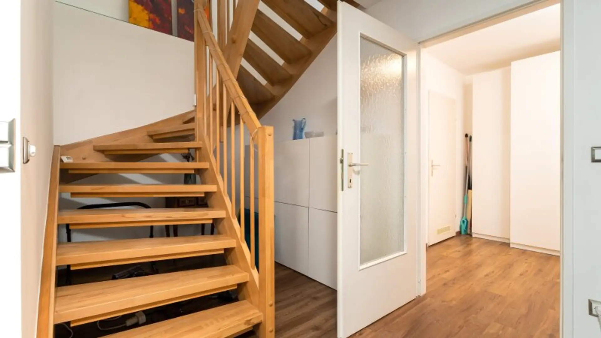 Im Vorraum befinden sich die Zugänge zum Abstellraum, Bad, WC und den Wohnbereich mit Stiegenaufgang.