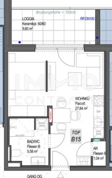 Raumaufteilung: Abstellraum, Bad/WC, Wohnküche (Küche nicht möbliert) mit abgetrennten Schlafbereich, Loggia.