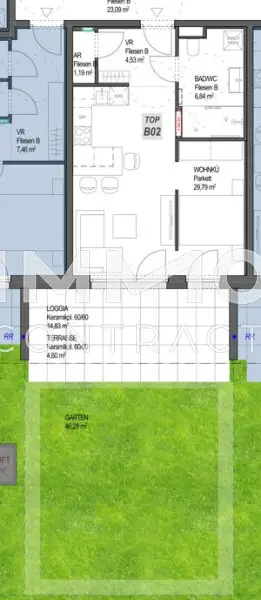 Raumaufteilung: Vorraum, Abstellraum, Bad/WC, Wohnküche (Küche nicht möbliert) mit abgetrennten Schlafbereich, Loggia/Terrasse, Gartenanteil.