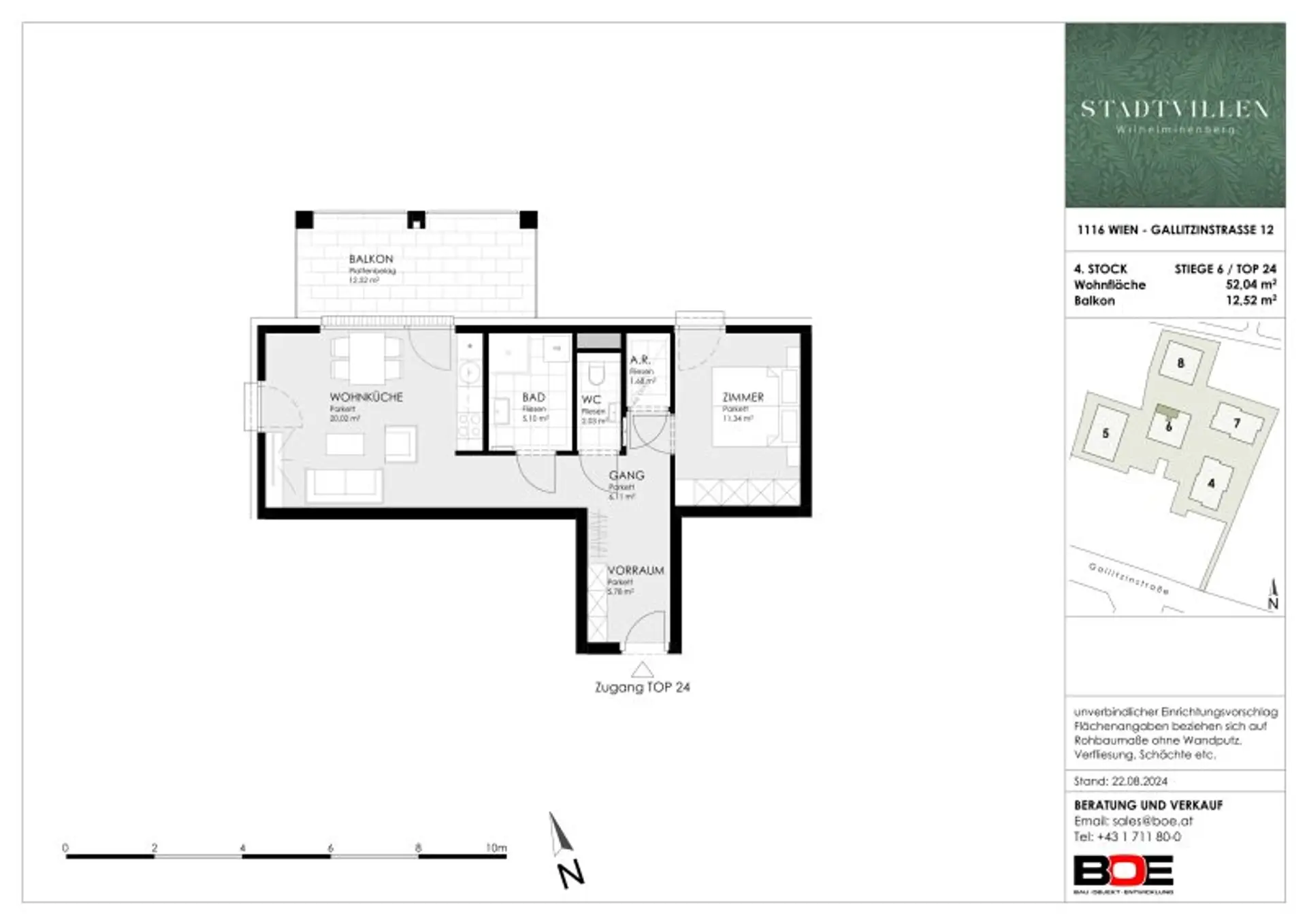 Die Wohnung Top 6.24 ist eine charmante 2 Zimmer Wohnung mit einem großen Balkon ( 12,52 m² ) im 4. Stock gelegen.