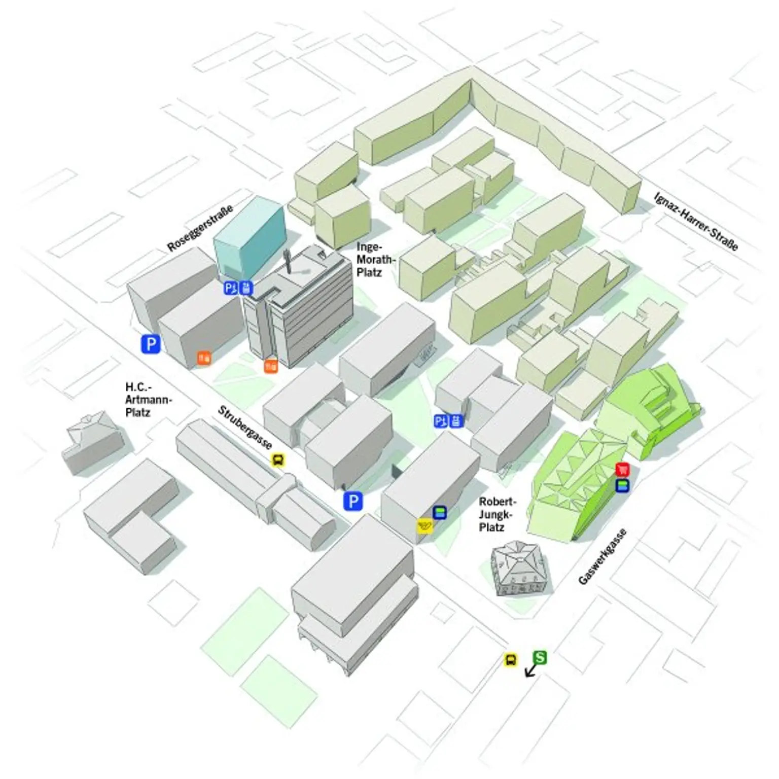 Eine öffentlich bewirtschaftete Tiefgarage bietet ausreichend Parkmöglichkeiten.