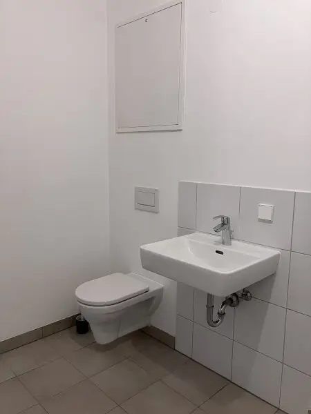 Das Bad mit WC und Dusche verfügt auch über einen Waschmaschinenanschluss.