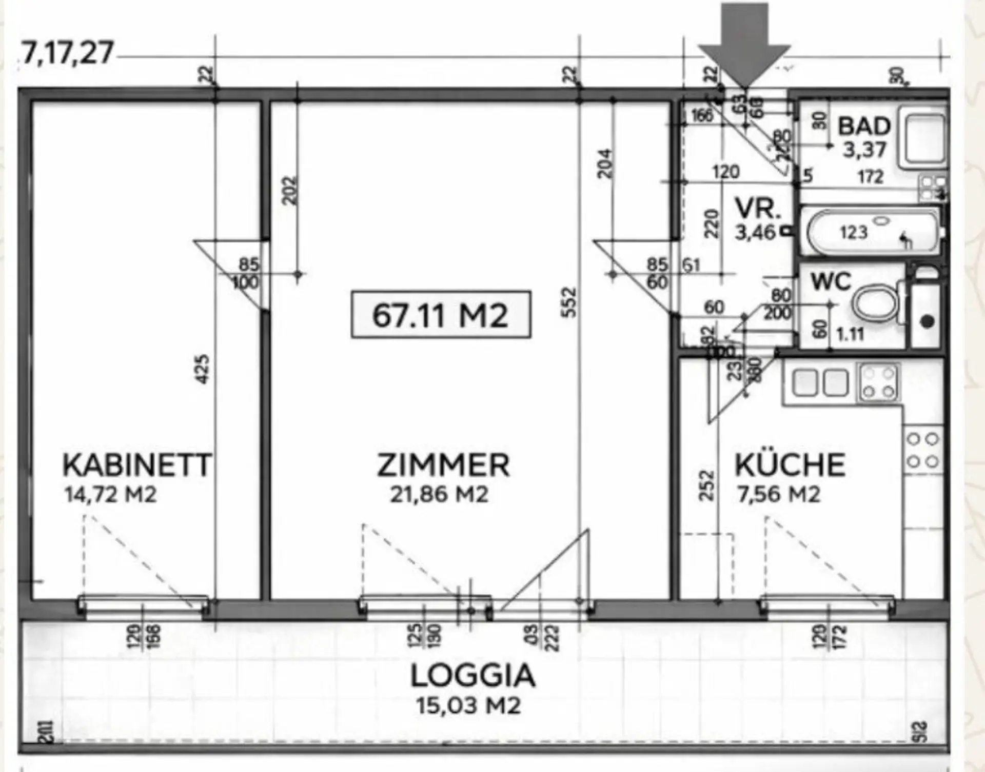 Die Wohnung inklusive verglaster Loggia verfügt über eine Wohnnutzfläche von ca. 67 m² und gliedert sich wie folgt: