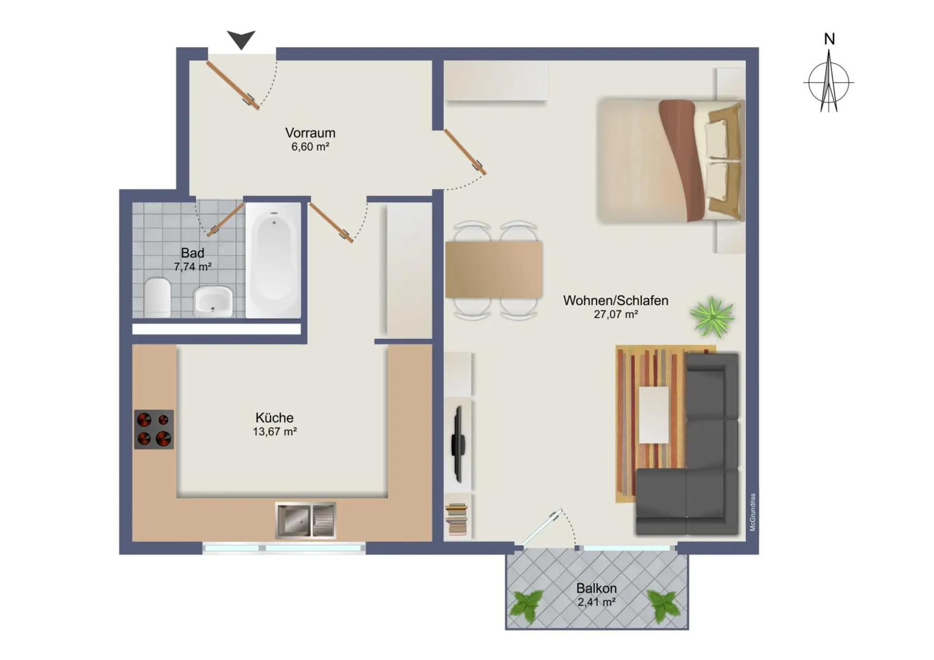Auf diesen ca. 51m² finden Sie ein ca. 27m² großes Zimmer, das sich vielseitig gestalten lässt. Von dort aus gelangen Sie direkt auf den nach Süden ausgerichteten überdachten Balkon. Die separate Küche ist ca. 14 m² groß.