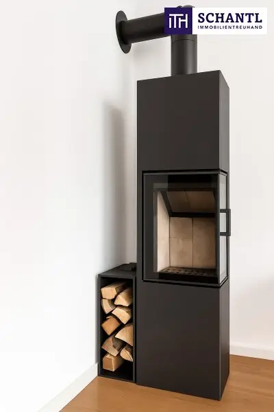 Ein moderner Kaminofen im Wohnbereich sorgt an kühleren Tagen für eine besonders behagliche Atmosphäre und setzt zugleich ein architektonisches Statement.