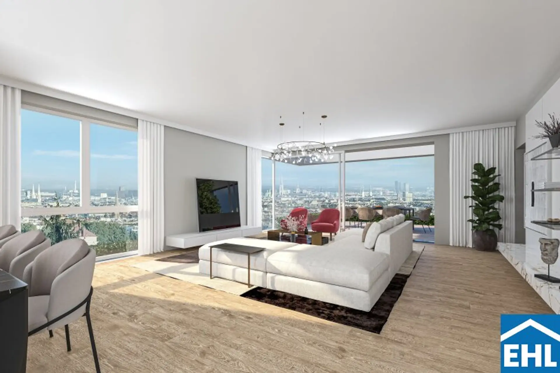 Klare Linien, großzügige Grundrisse und Wohnflächen zwischen ca. 130 und 175 m² schaffen Raum für individuelle Entfaltung. Große Fensterfronten holen Licht und Ausblick ins Innere – vom Sonnenaufgang über der Stadt bis zum abendlichen Lichtermeer.