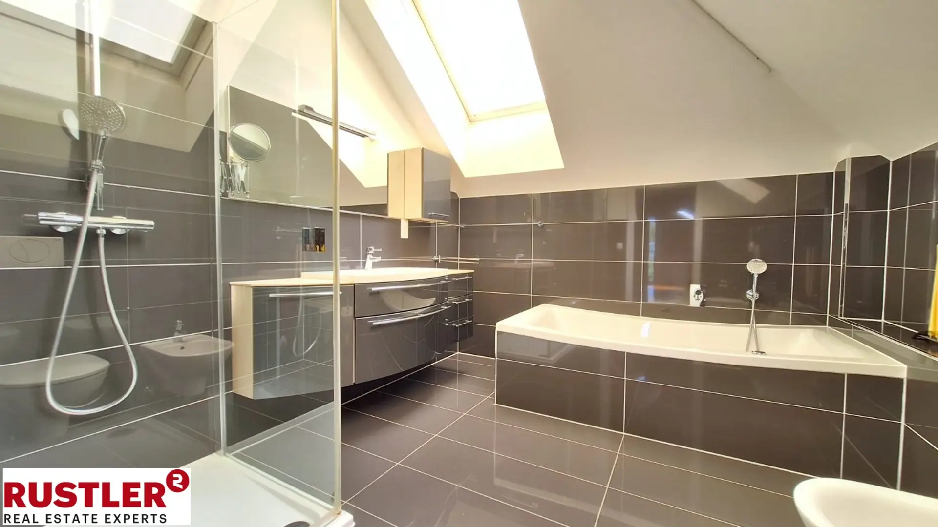 Ein großes Schlafzimmer mit eigenem Schrankraum und großem Tageslichtbad, ausgestattet mit Dusche, Badewanne, Doppelwaschtisch, WC und Bidet, komplettieren das Obergeschoss.