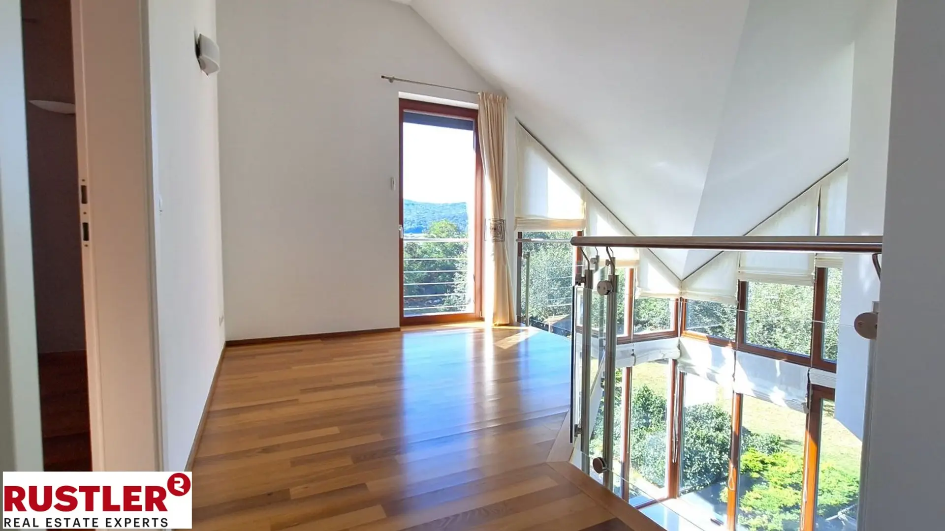 Über das offene Stiegenhaus gelangen Sie ins helle Obergeschoss, wo Sie von einer Galerie mit tollem Blick ins Grüne empfangen werden. Von dort aus verteilen sich sternförmig die Schlafbereiche sowie ein Badezimmer. Zwei Zimmer bieten einen grandiosen Weitblick nach Wien mit Ausgang auf den Balkon.