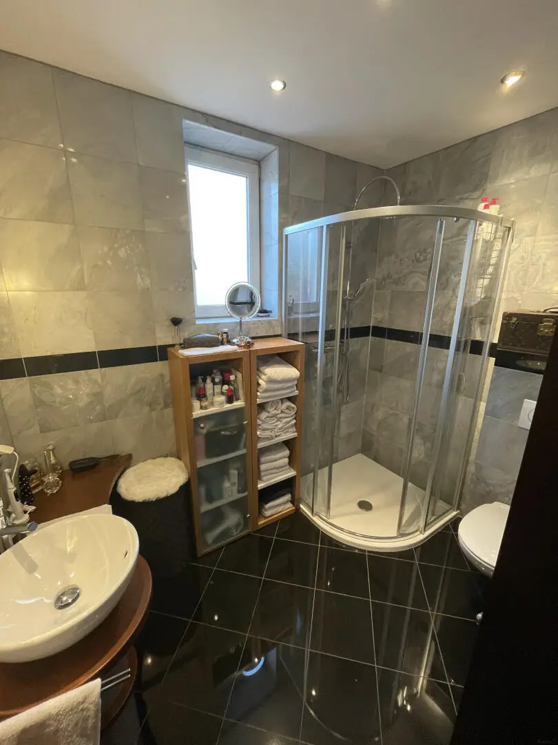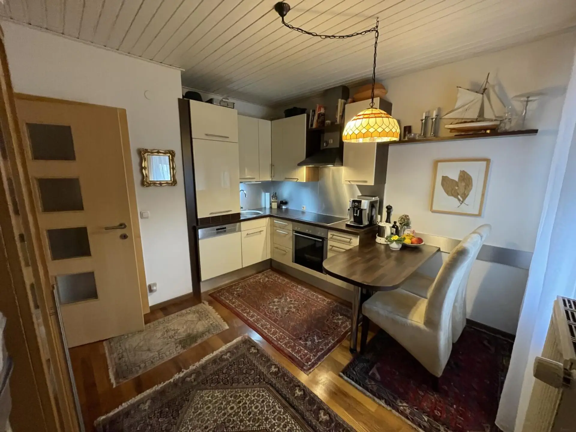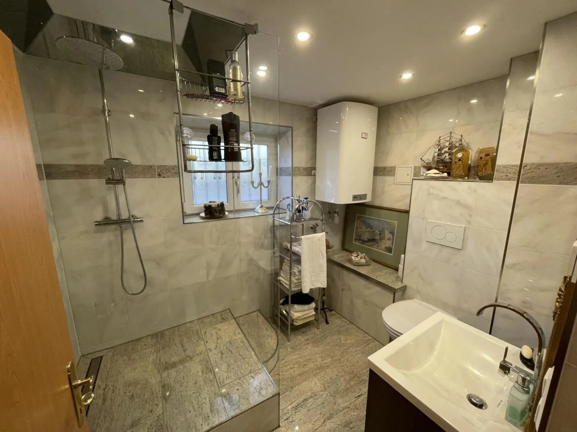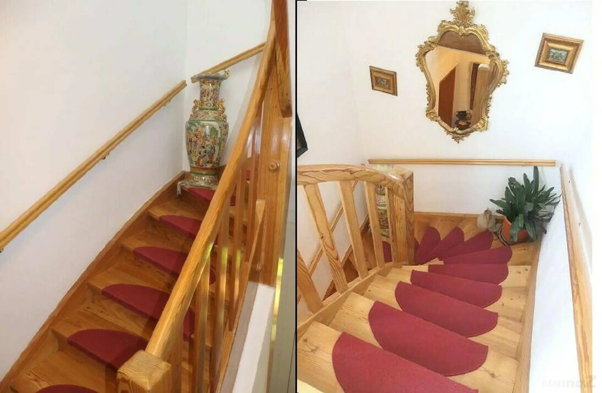 und ein über eine schöne Holztreppe erreichbares Dachgeschoss (Netto ca, 52m²) mit Wohnraum-Küche, 2 Zimmer, Bad/WC und 2 Terrassen (Terrassentüren mit Balken).