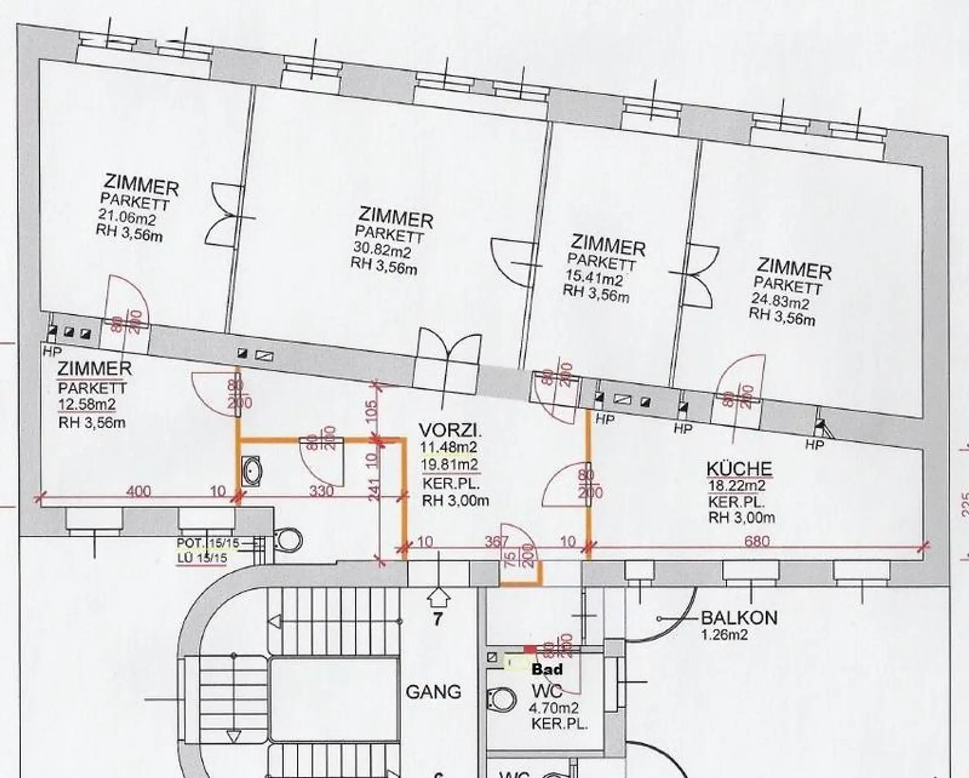 Zentrales Vorzimmer, 5 Zimmer, Küche, 2 Bäder, 2 WC, kleiner Balkon