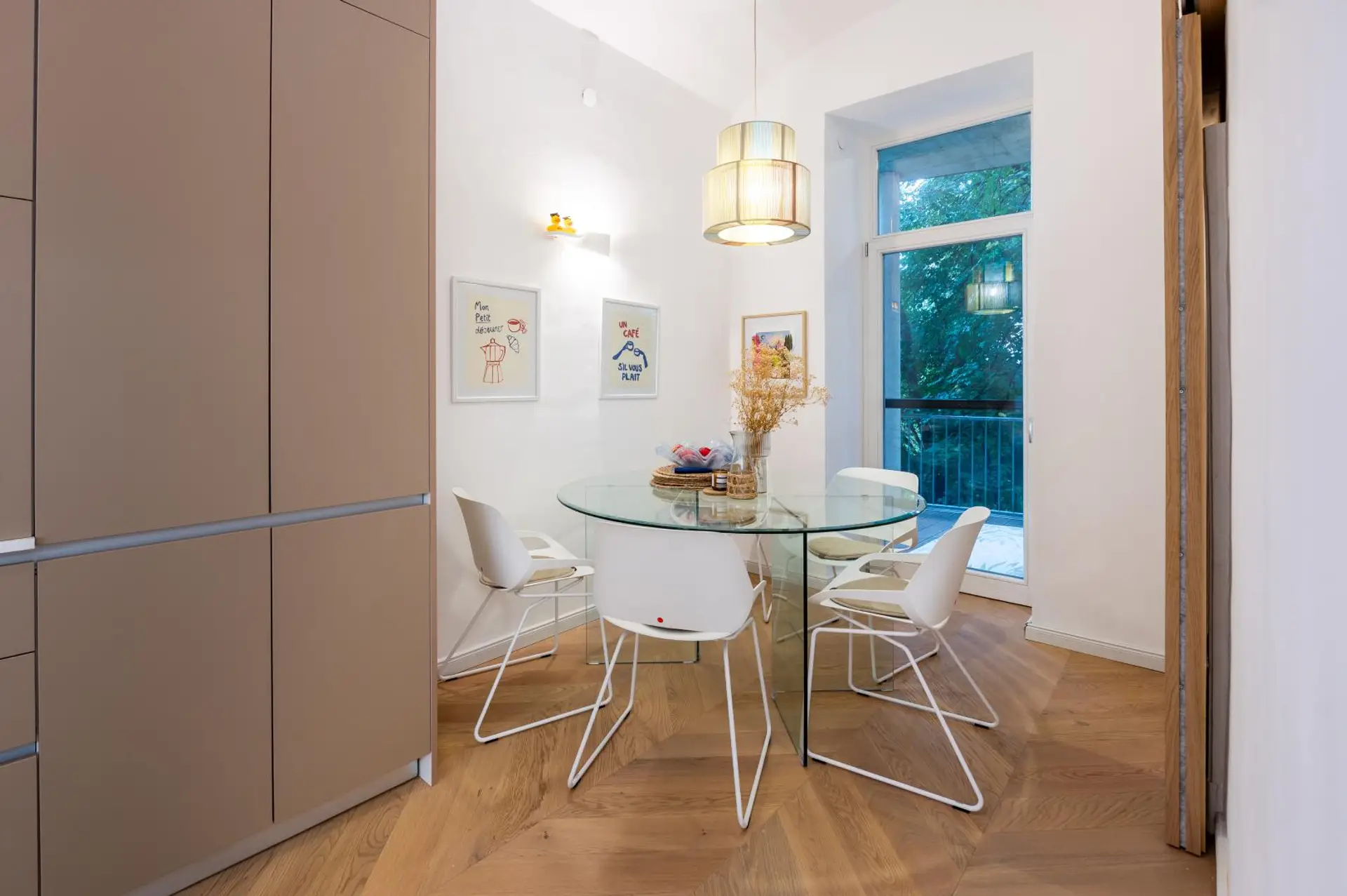 Der neue französische Klebeparkett im Fischgrätmuster sorgen mit den hohen Räumen und den Flügeltüren für das klassische Altbaufeeling.