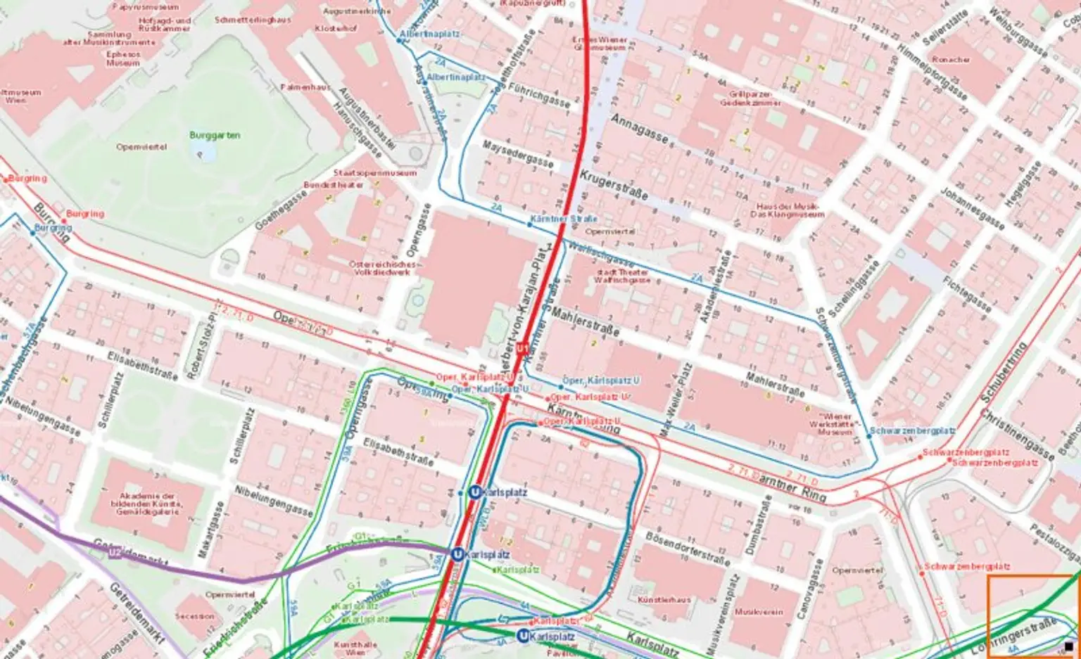 Die Lage ist einfach perfekt: es ist eine sehr gute öffentliche Verkehrsanbindung gegeben - sowohl im Nahverkehr durch die U-Bahnlinie 1, 2, 4 (Karlsplatz), die Straßenbahnlinien 1, 2, 71, D, 62 (Oper, Karlsplatz) sowie durch die Buslinien 59 A (Oper, Karlsplatz), die sich in wenigen Gehminuten erreichen lassen, als auch im Fernverkehr durch die Badner Bahn (Wiener Oper).
