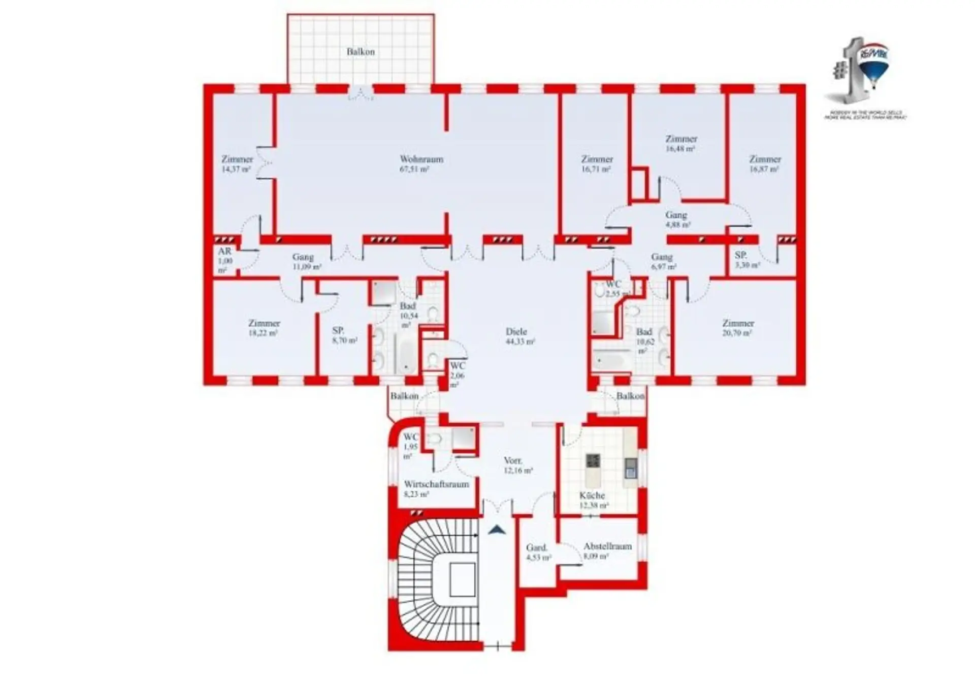 Zur Vermietung gelangt eine außergewöhnliche, ca. 333 m² große top sanierte 8 Zimmer Altbauwohnung in 1080 Wien. Sie befindet sich im 2. Liftstock eines komplett revitalisierten Hauses aus der Jahrhundertwende. Aufgrund der Lage im Hof ist die Wohnung sehr ruhig. Sie haben einen freien Ausblick in den weitläufigen herrlich begrünten Innenhof. Die Wohnung wurde vor Kurzem generalsaniert. Sie teilt sich auf in einen Wohnsalon mit ca. 67 m², 6 weitere Zimmer, Diele mit ca. 44 m², 3 Bäder, Küche, Abstellraum und Wirtschaftsraum. Begehbare Kleiderschränke bzw. Garderoben stehen ebenfalls zur Verfügung. Der südseitig ausgerichtete Balkon mit ca. 14 m² bietet Ihnen einen herrlichen Ausblick in den großzügigen und begrünten Innenhof. Neben diesem Balkon sind zwei weitere kleine Balkone vorhanden.