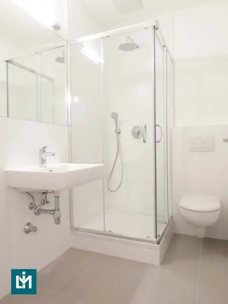 Badezimmer mit Dusche, Waschbecken, WC und Waschmaschinenanschluss