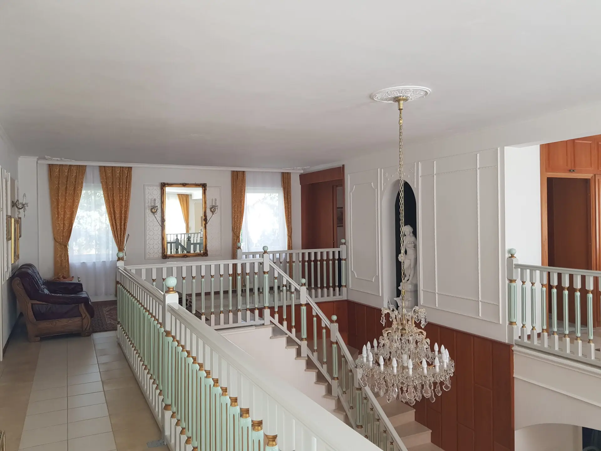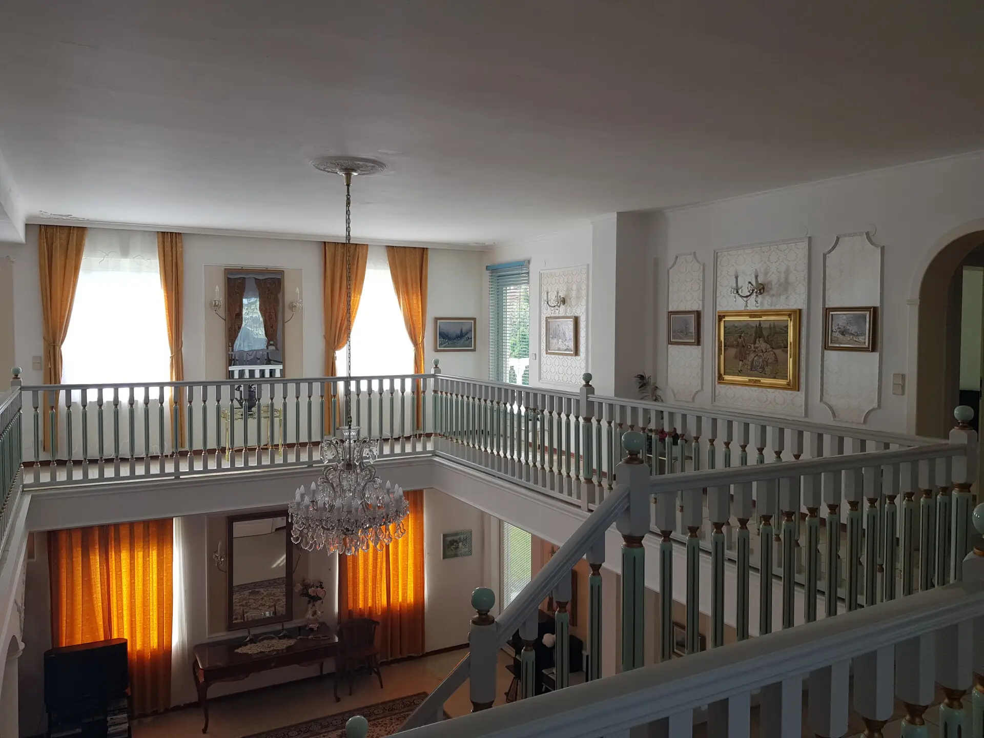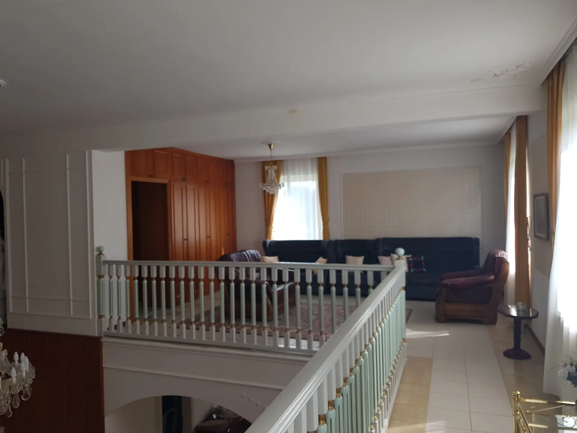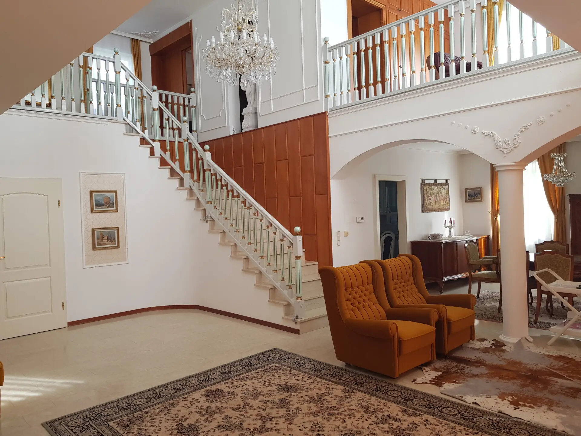 Im Obergeschoss werden sämtliche Wohnwünsche durch einen einem Herrenhaus gerecht werdenden Galeriebereich mit vorgelagertem Terrassenbereich inkl. herrlicher Aussicht in die Region, drei weitere Schlafzimmer sowie eine Bibliothek und ein vom Badezimmer mit Badewanne und Dusche getrenntes WC vervollständigt.