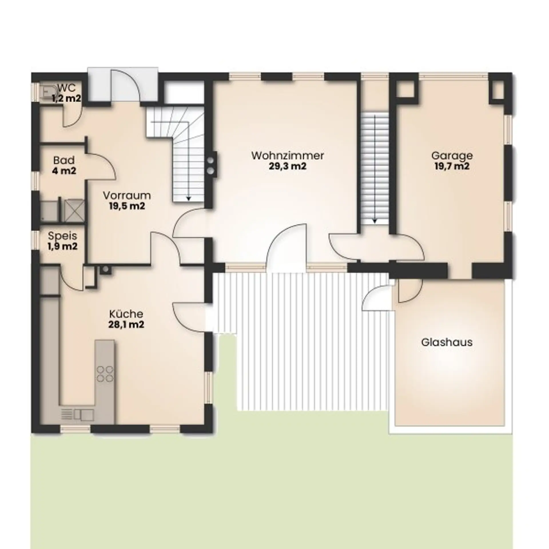 Das Einfamilienhaus befindet sich in einer verkehrsruhigen Straße im 22. Bezirk von Wien und ist von einem gepflegten Vorgarten umgeben. Durch den zentral gelegenen Eingangsbereich gelangt man sowohl direkt in das großzügige Wohnzimmer als auch in den ebenfalls ausladenden Bereich von Esszimmer und offener Küche. Die Gestaltung des Raumes ermöglicht eine flexible Nutzung und lässt viel Raum für individuelle Gestaltungsmöglichkeiten. Ein Kamin sorgt für behagliche Atmosphäre an kalten Winterabenden. Die Küche ist gut ausgestattet und verfügt über alle nötigen Geräte. Das Esszimmer ist direkt an die Küche angeschlossen und bietet ausreichend Platz für gemeinsame Mahlzeiten mit Freunden und Familie. Zur Abrundung des Erdgeschosses ist natürlich ein Bad, eine Speis, eine Garderobe und WC vorhanden.
