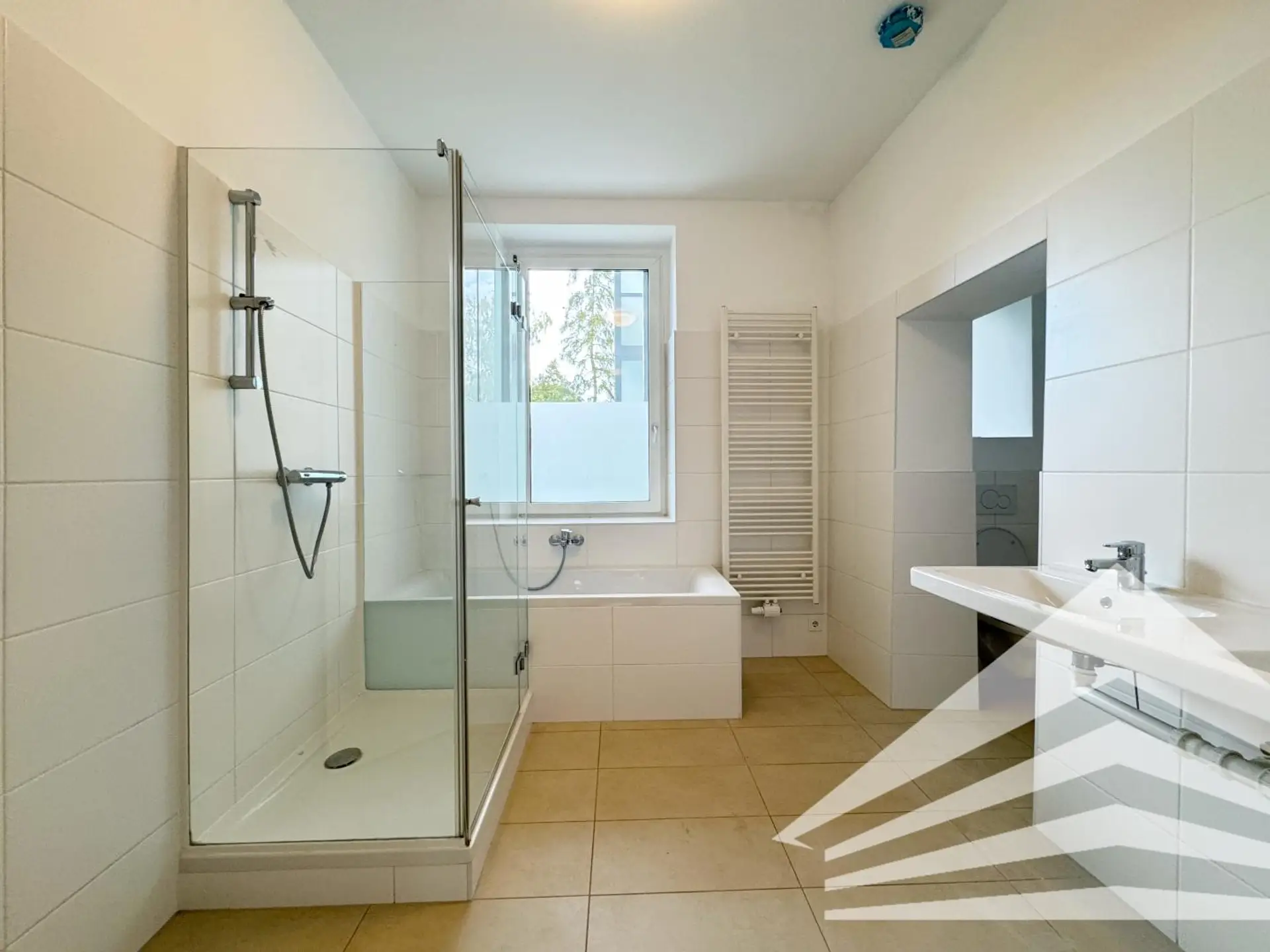 - Modernes Tageslicht Badezimmer mit Dusche, Badewanne, Doppelwaschbecken und angrenzendem WC