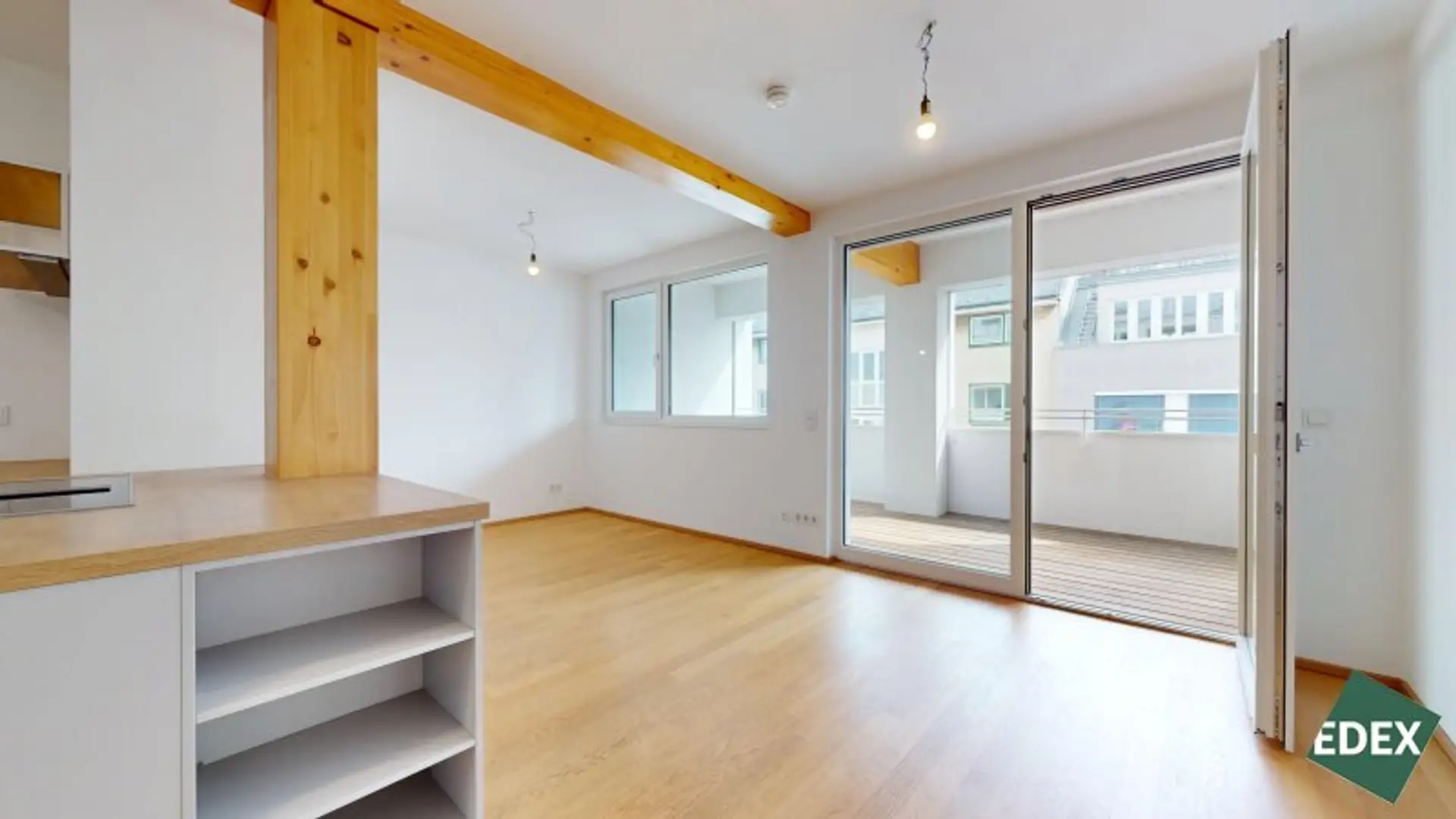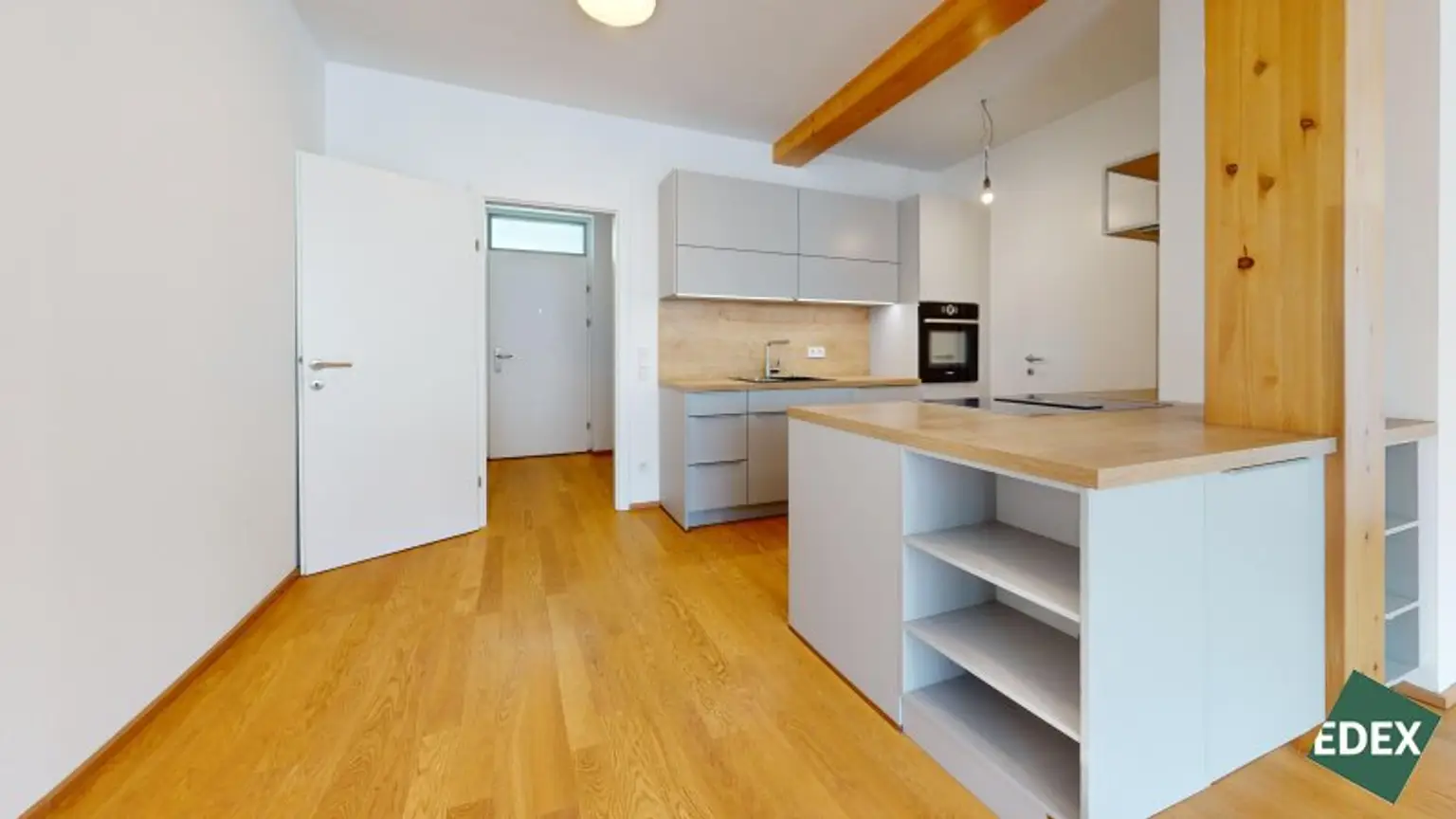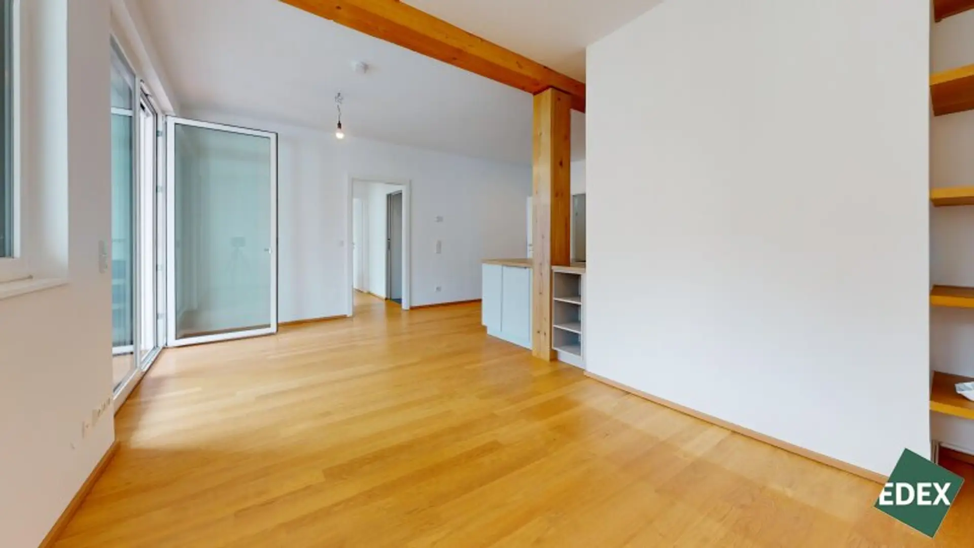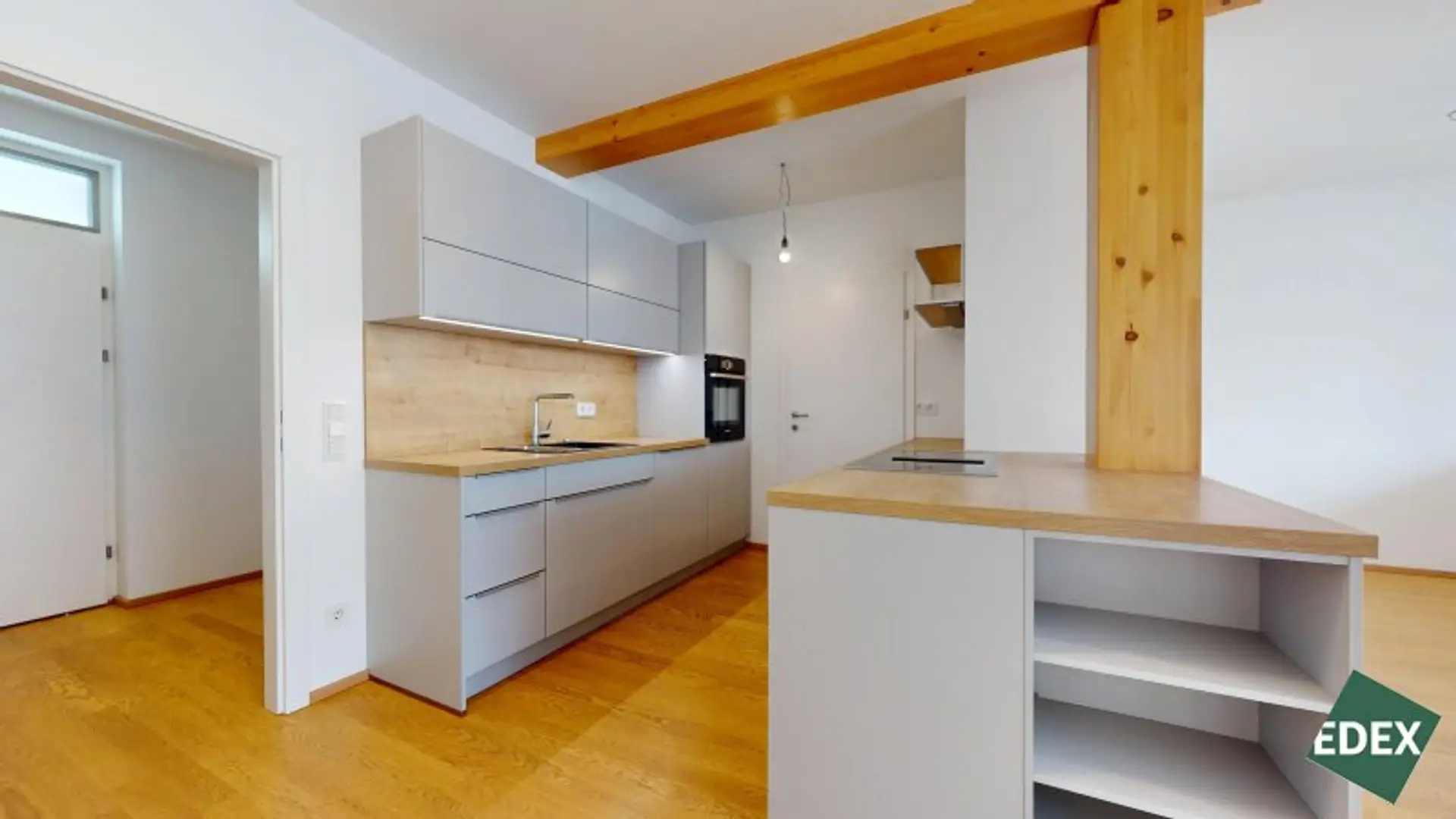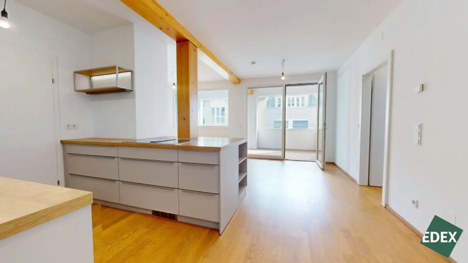 Besonderes Highlight ist der effiziente Grundriss mit einem hellen Wohn-/Essbereich, welcher direkt mit der südöstlich gelegenen Loggia (11 m²) verbunden ist. Die große Fensterfront der Wohnküche sorgt für viel natürliches Licht. Gegen die warmen Sommerwochen dient ein außenliegender Sonnenschutz. Die moderne Einbauküche ist mit Markengeräten vollausgestattet und im Kaufpreis inbegriffen. Eine Speisekammer/Abstellraum sorgt für zusätzlichen Stauraum. Die 2 Schlafzimmer haben eine gute Größe und sind über einen Gang zentral begehbar. Das Badezimmer ist mit modernen Fliesen versehen und verfügt über eine Badewanne, eine Doppelwaschbecken, ein WC, eine Dusche und einen Waschmaschinenanschluss. Zudem gibt es ein Gäste-WC.