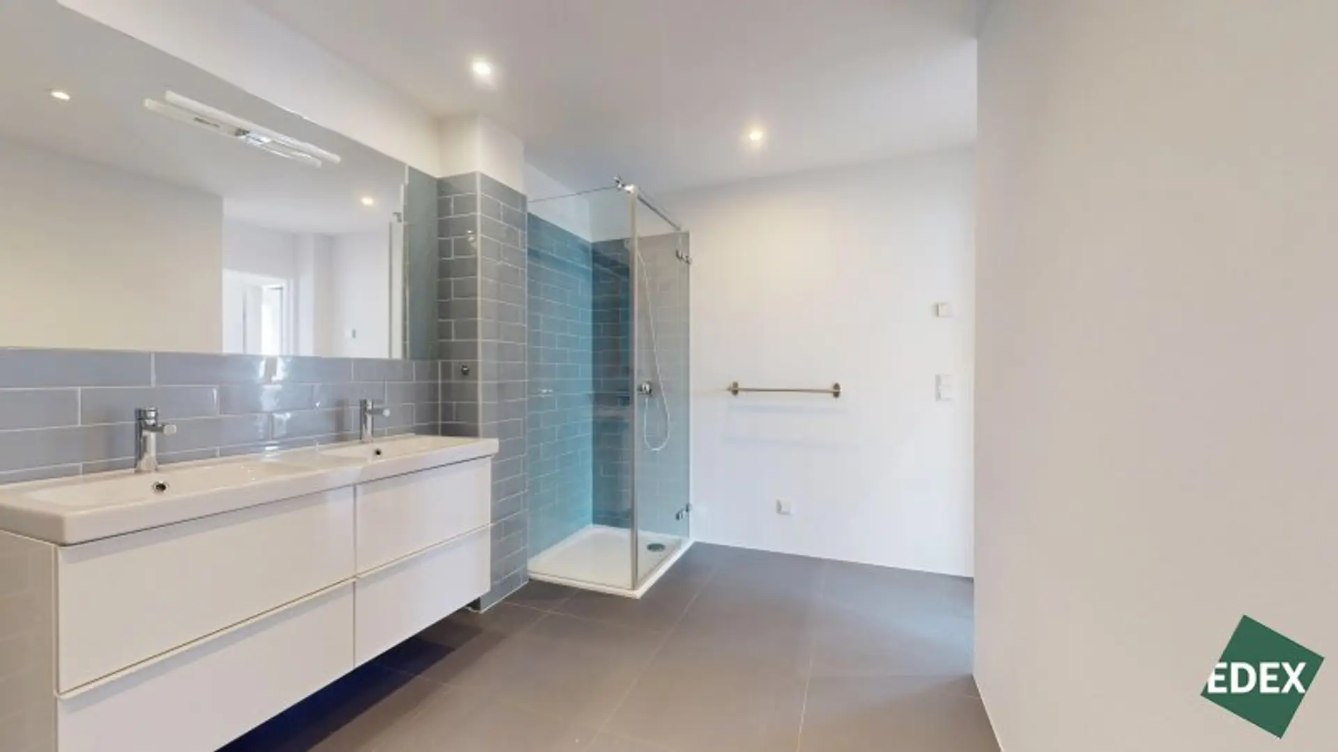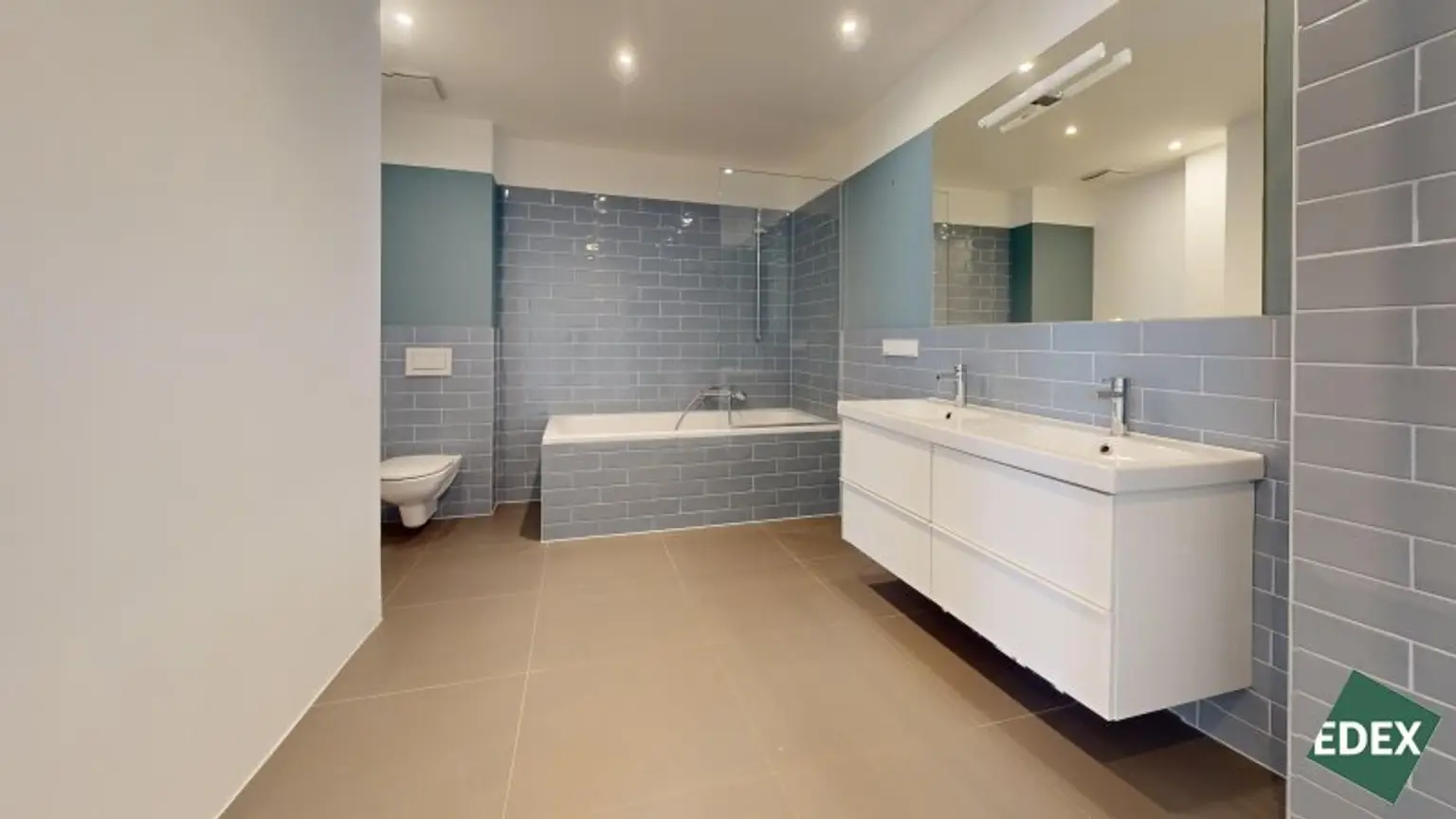 * Badzimmer mit Doppelwaschbecken, Dusche, Badewanne und WC