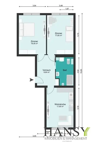 Das Herzstück der Wohnung bildet die großzügige Wohnküche mit ca. 18 m², die ausreichend Platz für Kochen, Essen und gemütliches Beisammensein bietet. Ergänzt wird das Raumangebot durch zwei weitere Zimmer, jeweils ca. 18 m² groß, die sich ideal als Schlaf-, Wohn- oder Arbeitszimmer eignen. Beide Zimmer sind zum ruhigen Innenhof ausgerichtet und garantieren somit höchste Wohnqualität. Bereits der Vorraum bietet ausreichend Platz für eine Garderobe und sorgt für einen einladenden ersten Eindruck. Durch die Ost- und Westausrichtung profitiert die Wohnung von optimalen Lichtverhältnissen über den gesamten Tag hinweg.