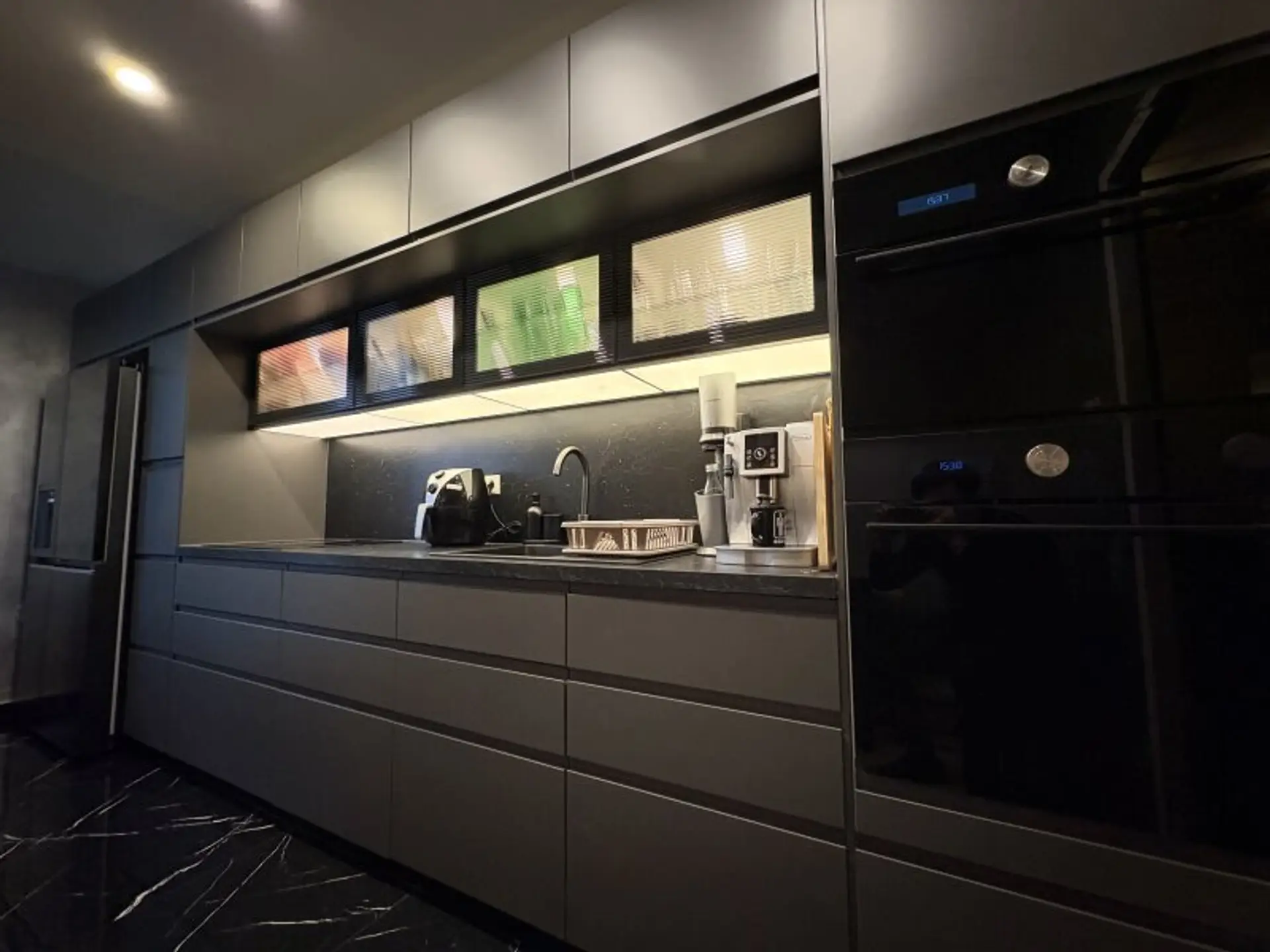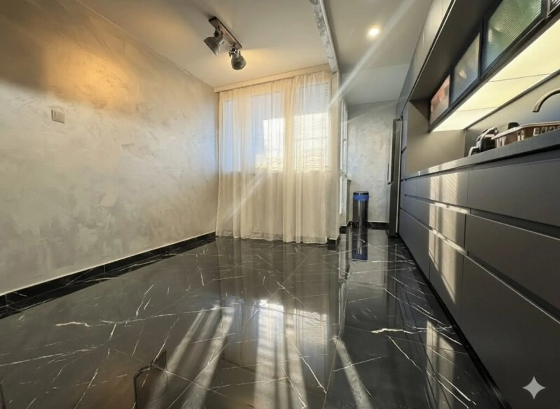 Ein besonderes Highlight ist die hochwertige Maßküche, die offen in den Wohnbereich integriert ist. Sie überzeugt durch Qualität, modernes Design und Funktionalität und lädt zum gemeinsamen Kochen und Genießen ein. Der Bodenbelag in hochwertiger Fliesenoptik in Marmoroptik unterstreicht den eleganten Charakter der Wohnung.