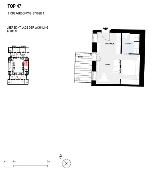 Das Herzstück der Wohnung bildet der ca. 17,90 m² große Wohnbereich mit direktem Zugang zum Balkon. Der abgetrennte Schlafbereich bietet Platz für ein Bett und einen Schrank, wodurch eine klare Trennung von Wohnen und Schlafen entsteht.