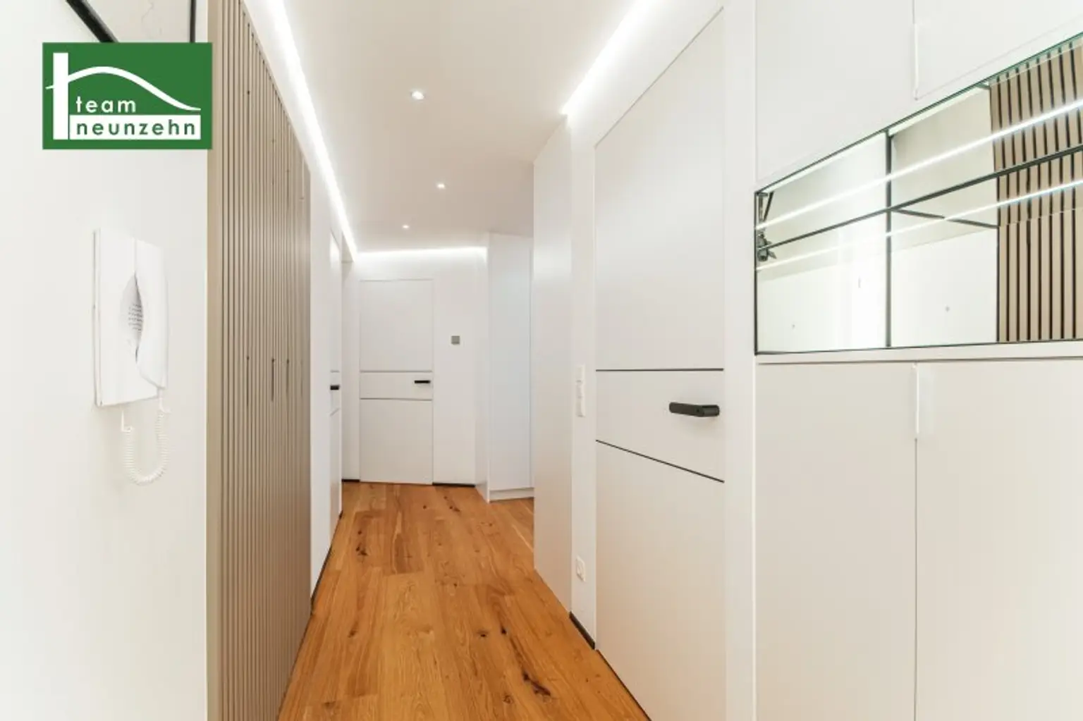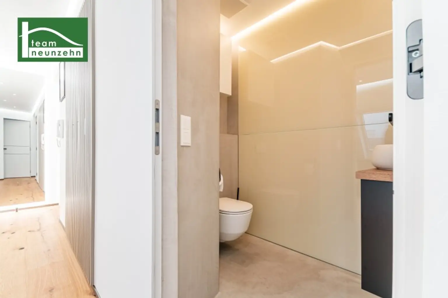 Ein großzügiger Vorraum mit eleganten Deckenspots eröffnet die Wohnung und unterstreicht den exklusiven Charakter. Ergänzt wird der Eingangsbereich durch einen praktischen Abstellraum sowie ein separates WC mit Handwaschbecken, hochwertig ausgeführt in modernem Mikrozement.