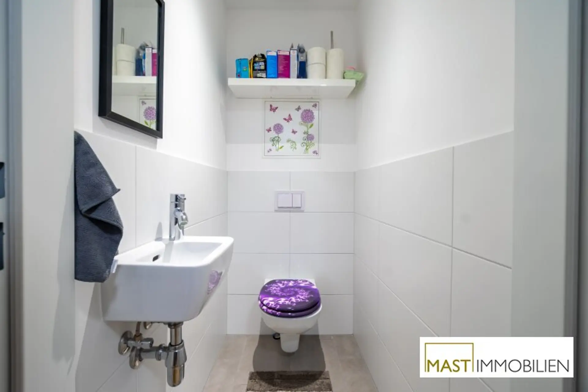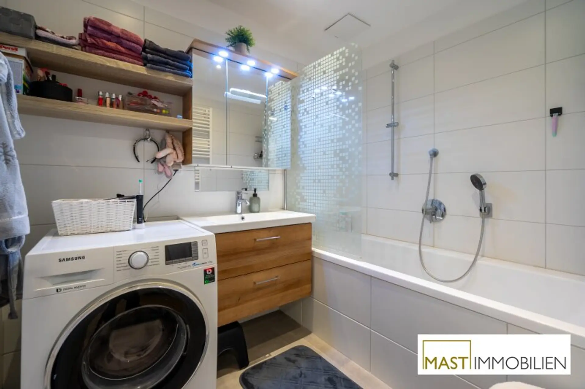 Die moderne Einbauküche inklusive aller Geräte ist funktional wie stilvoll gestaltet und fügt sich harmonisch in den Wohnraum ein. Das Badezimmer ist mit einer Badewanne ausgestattet, zusätzlich steht ein separates WC mit Waschbecken zur Verfügung – ein echtes Plus im Alltag.