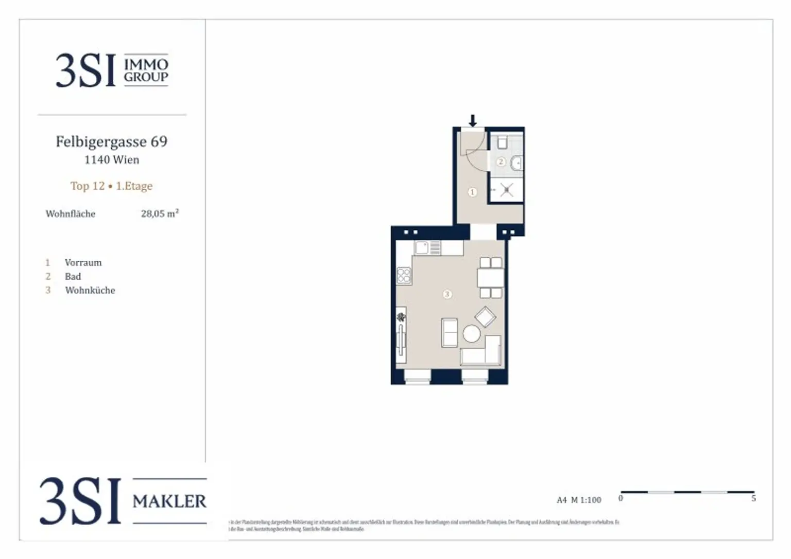 Die Wohnung verfügt über einen Vorraum, ein modernes Badezimmer sowie eine gut geschnittene Wohnküche, die trotz kompakter Größe ein angenehmes und funktionales Wohngefühl vermittelt.