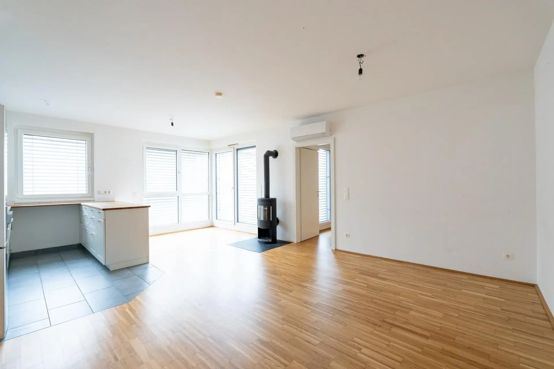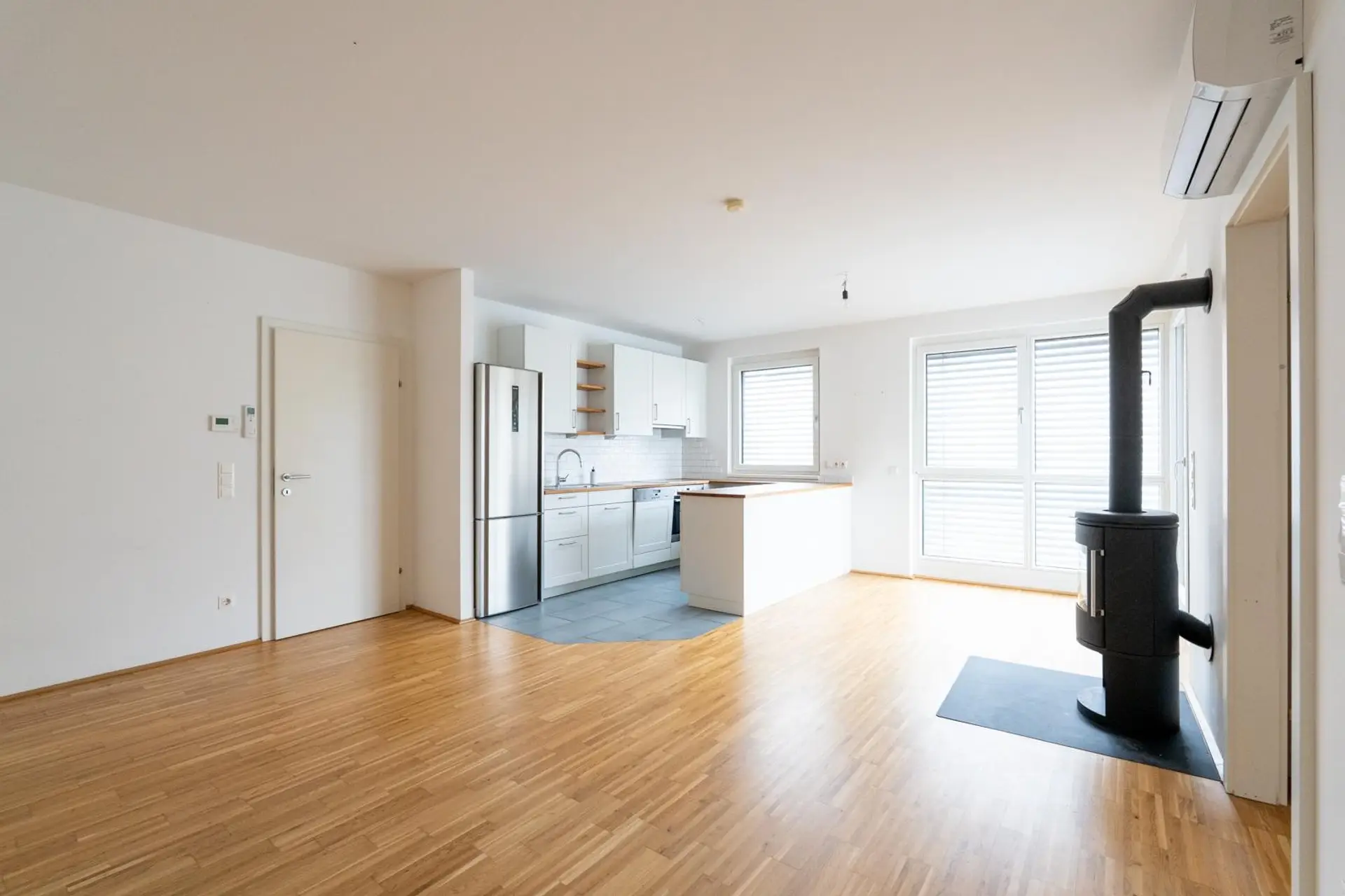 Das Herzstück der Wohnung bildet das großzügige Wohnzimmer mit einer offenen Designküche samt Kochinsel – ein perfekter Ort für gesellige Abende und kulinarische Highlights. Für besondere Atmosphäre sorgt der offene Kamin, der gerade in den Wintermonaten für gemütliche und entspannte Stunden sorgt.
