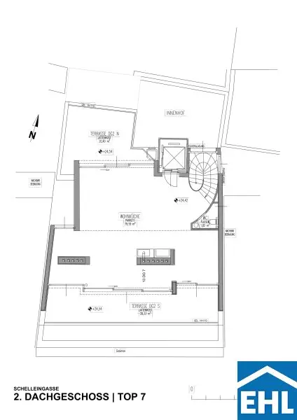 Die Wohnküche bietet direkten Zugang zu einer Ihrer, in den Innenhof ausgerichteten, Dachterrassen. Hier können Sie die warmen Sonnenstrahlen genießen, entspannen oder gesellige Abende mit Freunden und Familie verbringen.