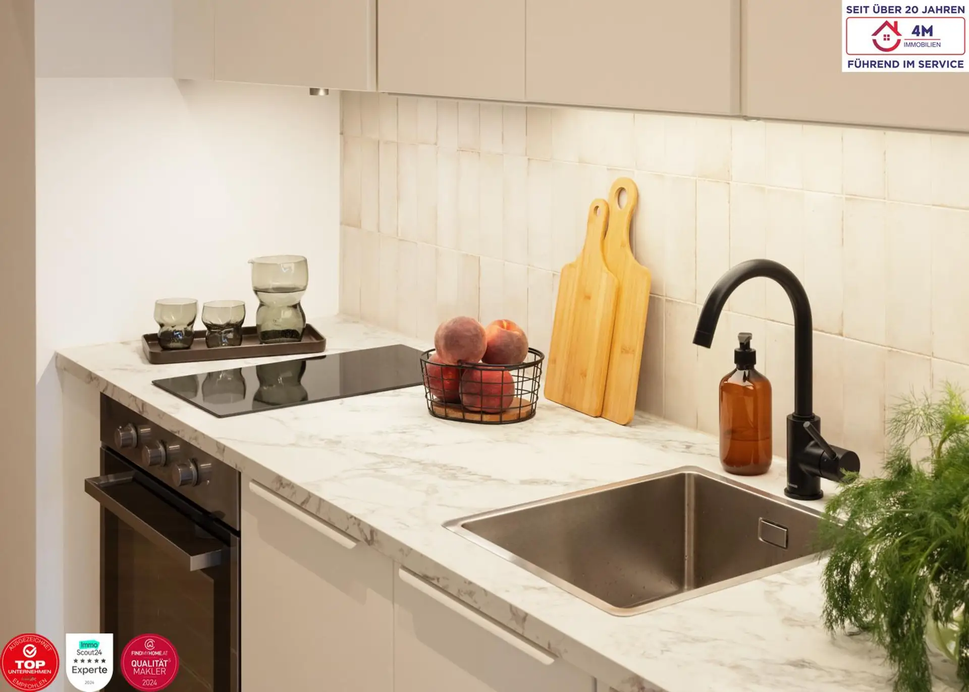 Küchenzeile mit hochwertigen Geräten (inkl. Kühlschrank, Induktionsherd, Dunstabzug, Backrohr), Spüle aus Edelstahl, viel Stauraum