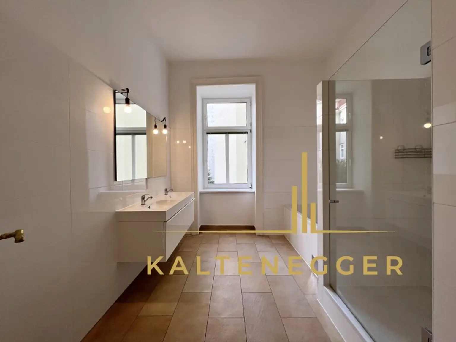 * Tageslichtbad mit Badewanne, Dusche, Doppelwaschbecken und Waschmaschinenanschluss