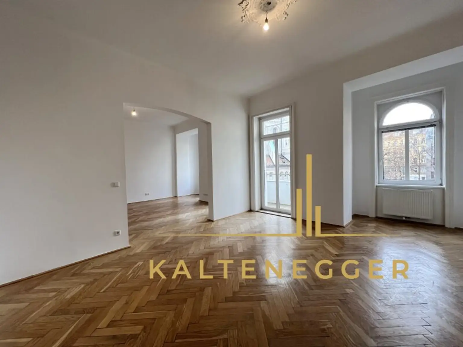 * Vier helle Zimmer (davon drei getrennt begehbar); eines der Zimmer ist über eine breite Wandöffnung – ohne Tür – harmonisch mit dem anschließenden Raum verbunden.