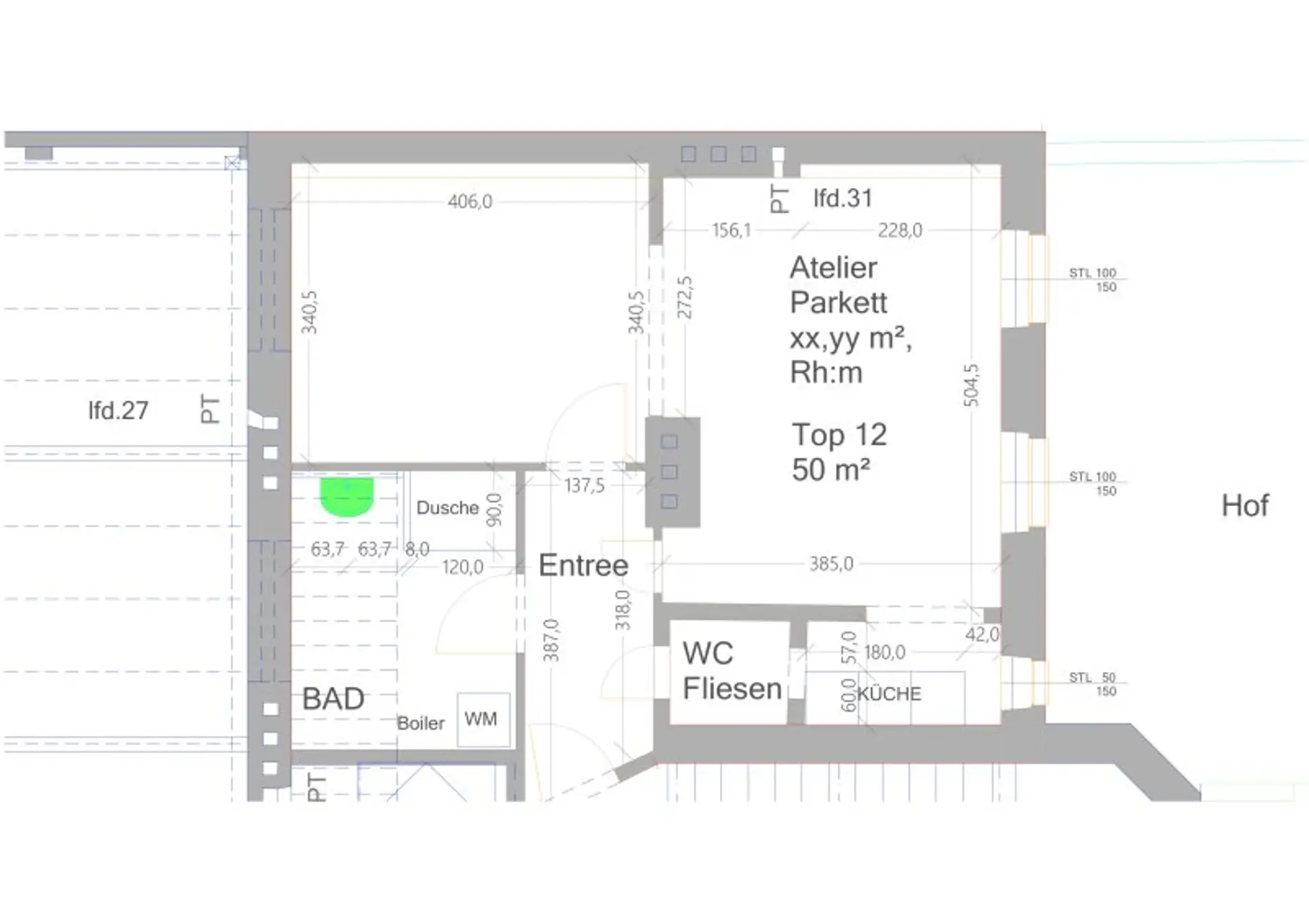 Der zentrale Atelierraum bietet durch seine klare Struktur und angenehme Proportionen vielfältige Nutzungsmöglichkeiten. Ergänzt wird die Fläche durch eine separate Küche, ein Badezimmer mit Dusche, ein WC sowie einen Vorraum, der eine klare Zonierung zwischen Arbeiten und Ankommen ermöglicht.