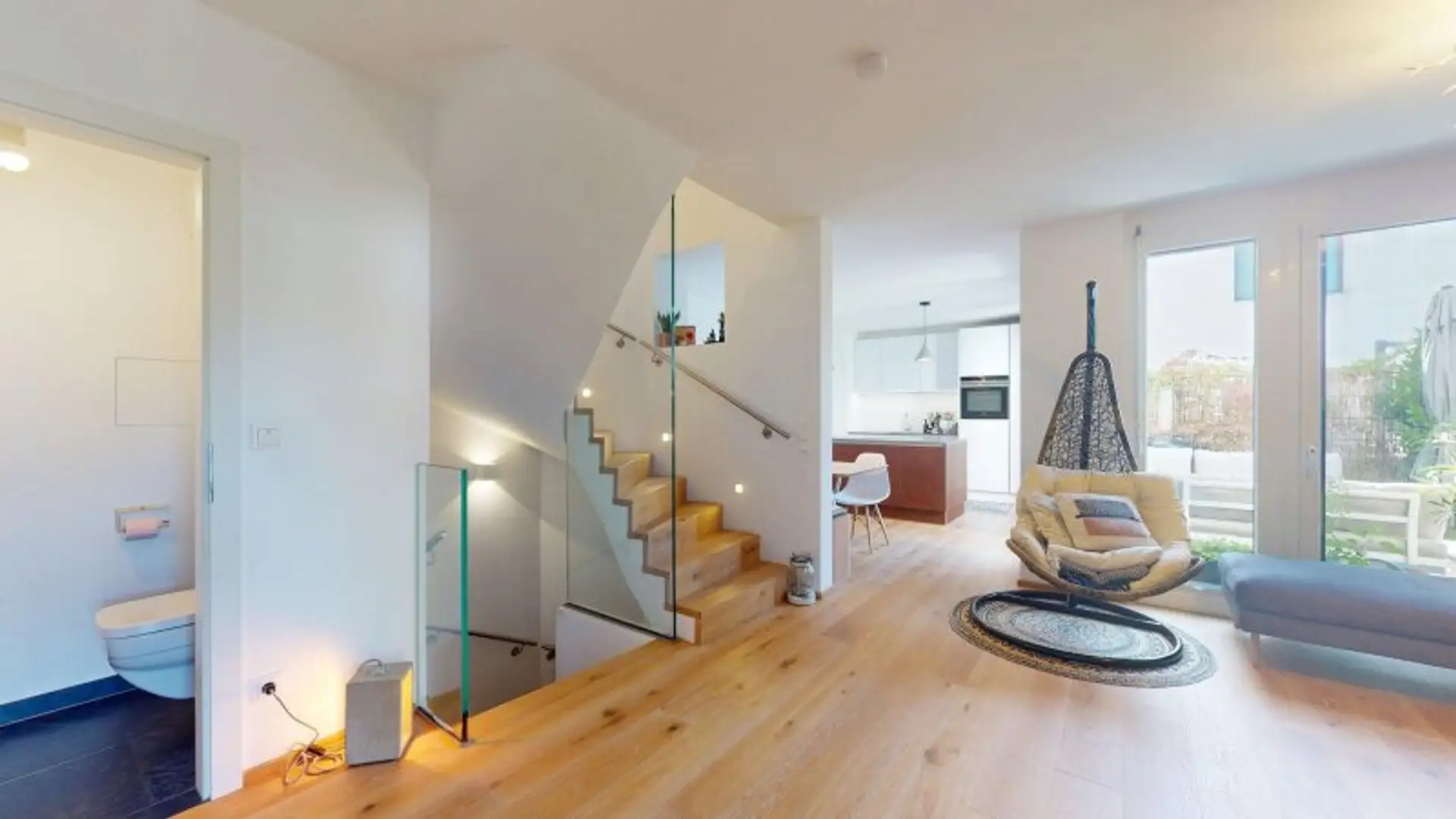 Echtholz-Dielen, Glas-Stiegengeländer, stimmige Beleuchtung
