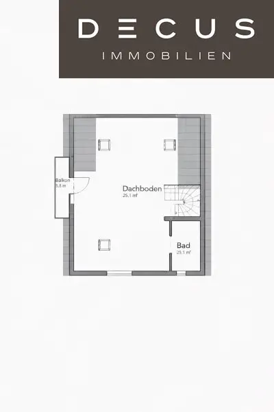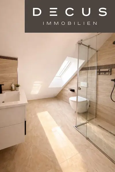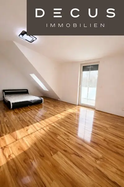 Das Dachgeschoss bietet zusätzlichen Wohnraum mit Dachflächenfenstern und Zugang zu einem Balkon.
