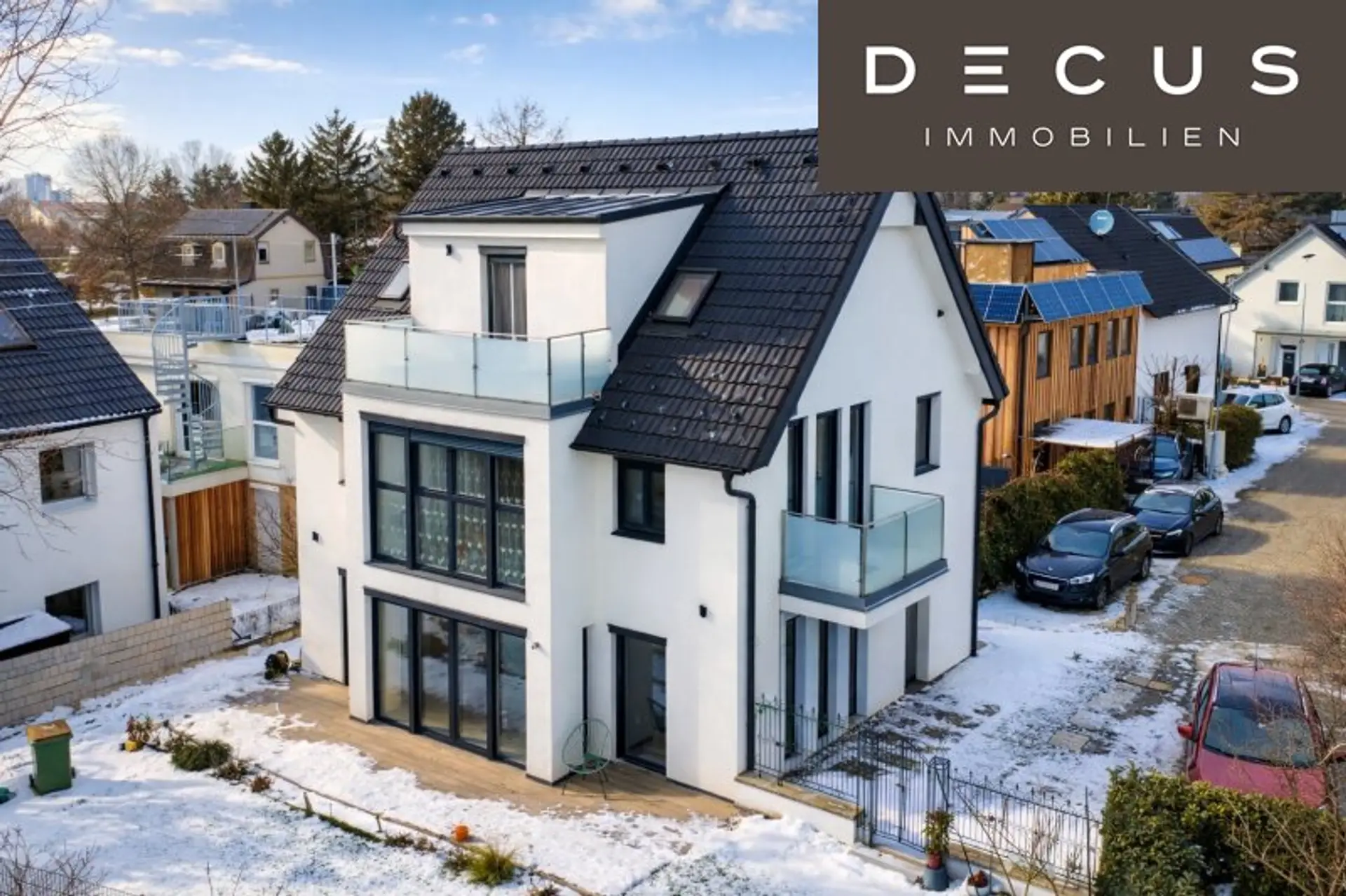 Moderne Glasgeländer und die klare Linienführung der Fassade verleihen dem Haus eine zeitlose, elegante Optik.