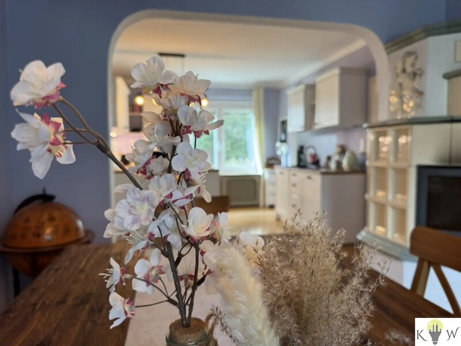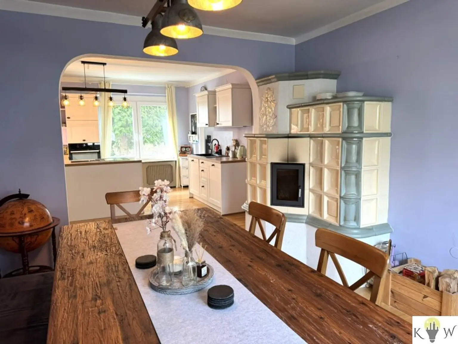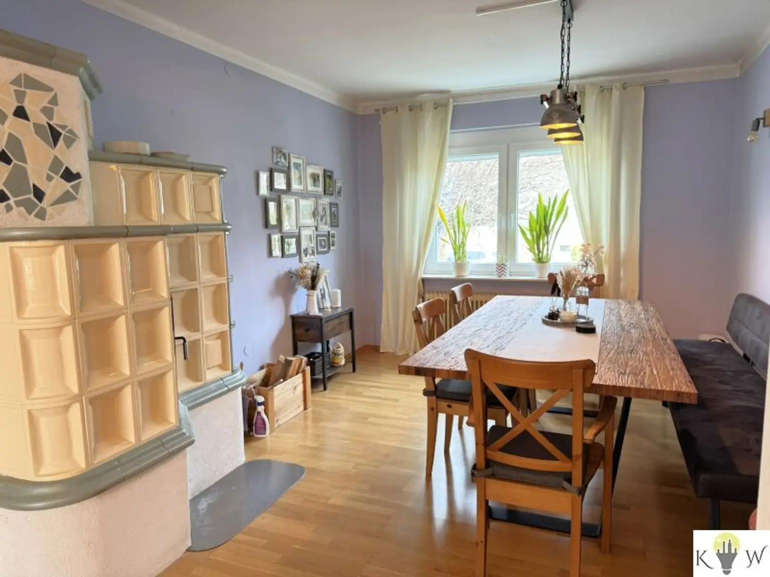 Die großzügige Essküche mit gemütlichem Kachelofen schafft einen besonderen Lebensmittelpunkt – ein Ort für gemeinsame Stunden und geselliges Beisammensein. Ergänzt wird das Erdgeschoss durch ein Schlafzimmer, ein modern saniertes Badezimmer, ein separates WC sowie einen praktischen Abstellraum.