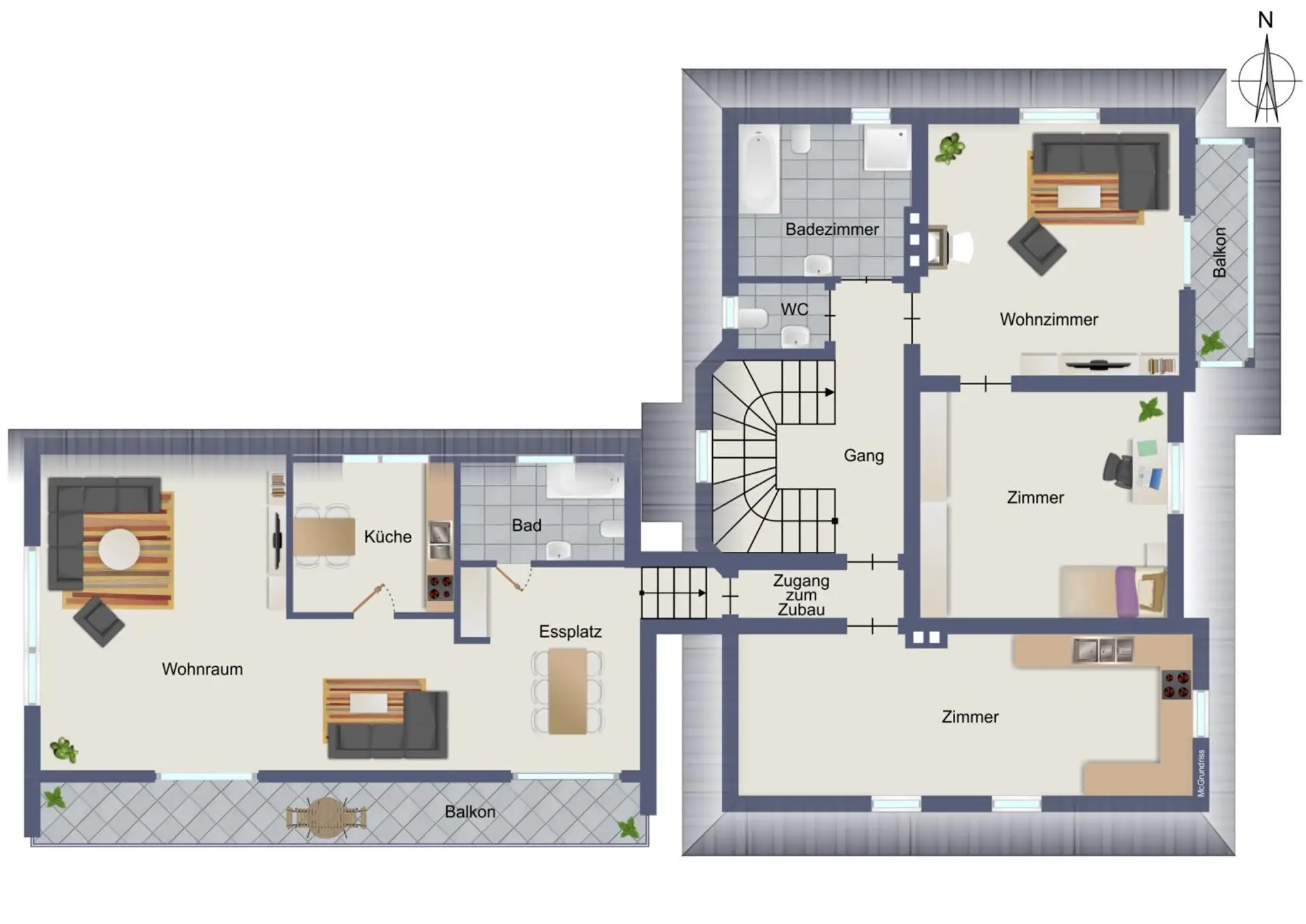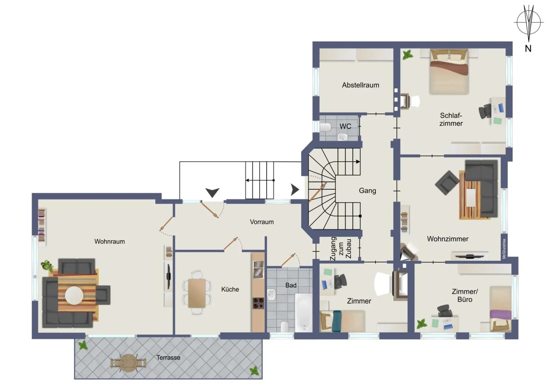 Der Altbau besticht durch seine großzügige Raumaufteilung: Sieben Zimmer, ein Abstellraum, zwei WCs und ein Badezimmer schaffen viel Raum für Familie, Hobbys und Homeoffice. Durchgänge im Erdgeschoss und Obergeschoss verbinden den Altbau nahtlos mit dem Zubau – ideal für alle, die Flexibilität und Offenheit im Wohnkonzept schätzen.