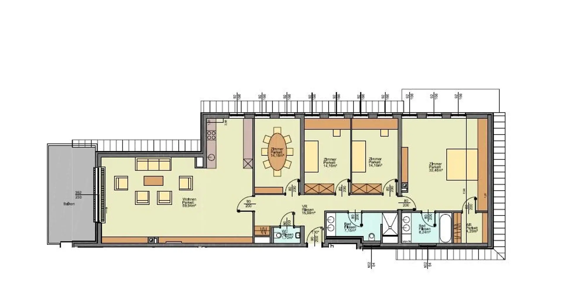 Auf ca. 170 m² Wohnfläche erwarten Sie zwei moderne Bäder, zwei separate WCs, ein praktischer Abstellraum und ein großer Balkon mit 18,3 m² – ideal für entspannte Stunden im Freien, ein gemütliches Frühstück oder gesellige Abende mit Freunden.